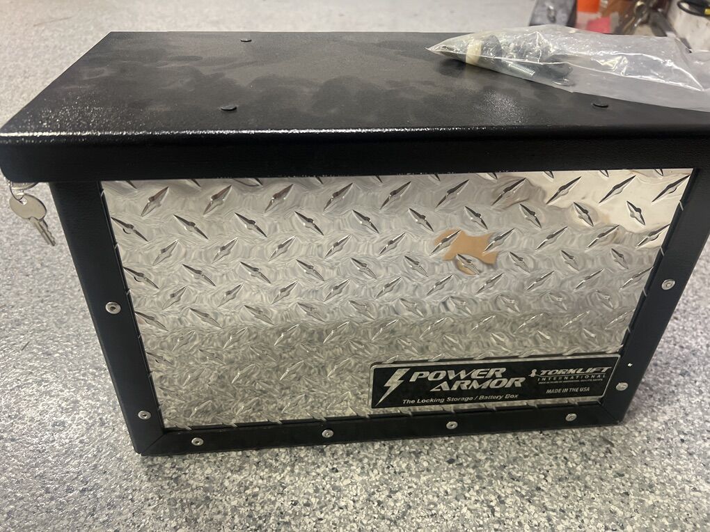 Selling a TorkLift PowerArmor Battery Box — a heavy-duty locking storage box designed for RVs, trailers, or truck campers. Made in the USA, this box is built from diamond plate aluminum with a black powder-coated lid, providing excellent weather resistance and security.