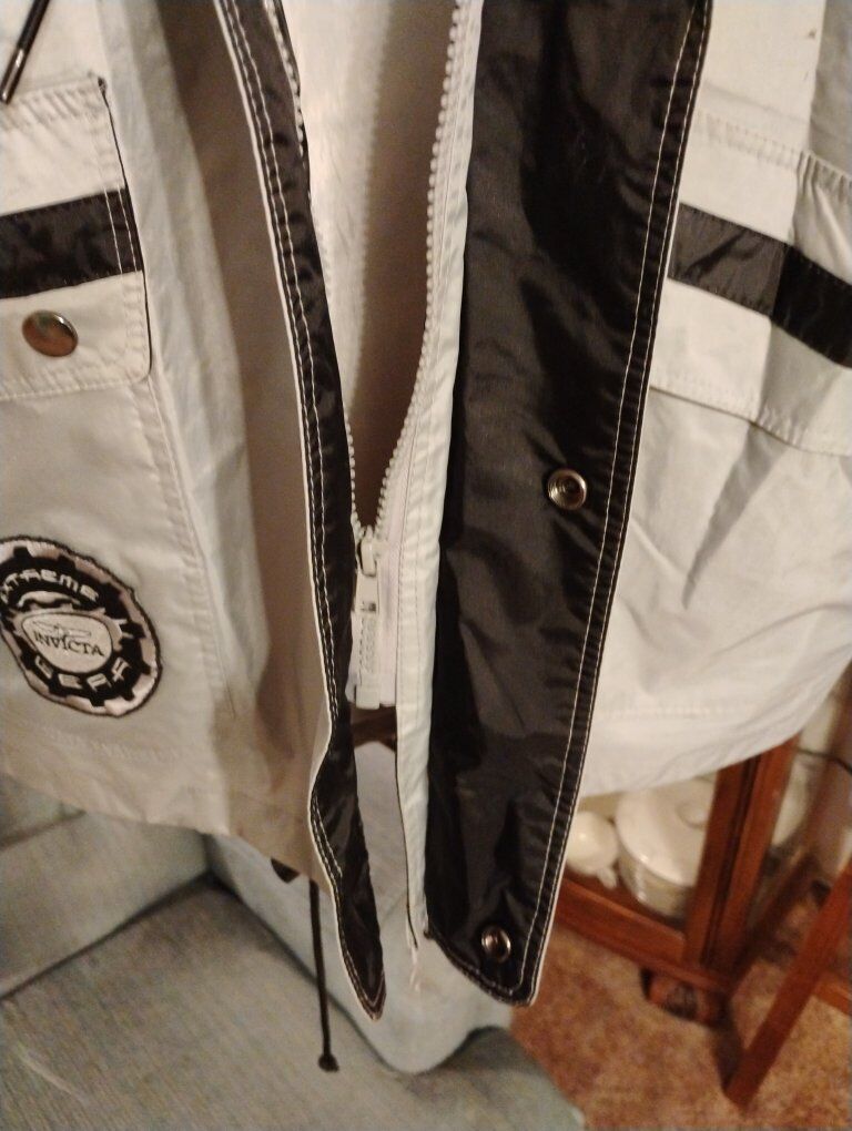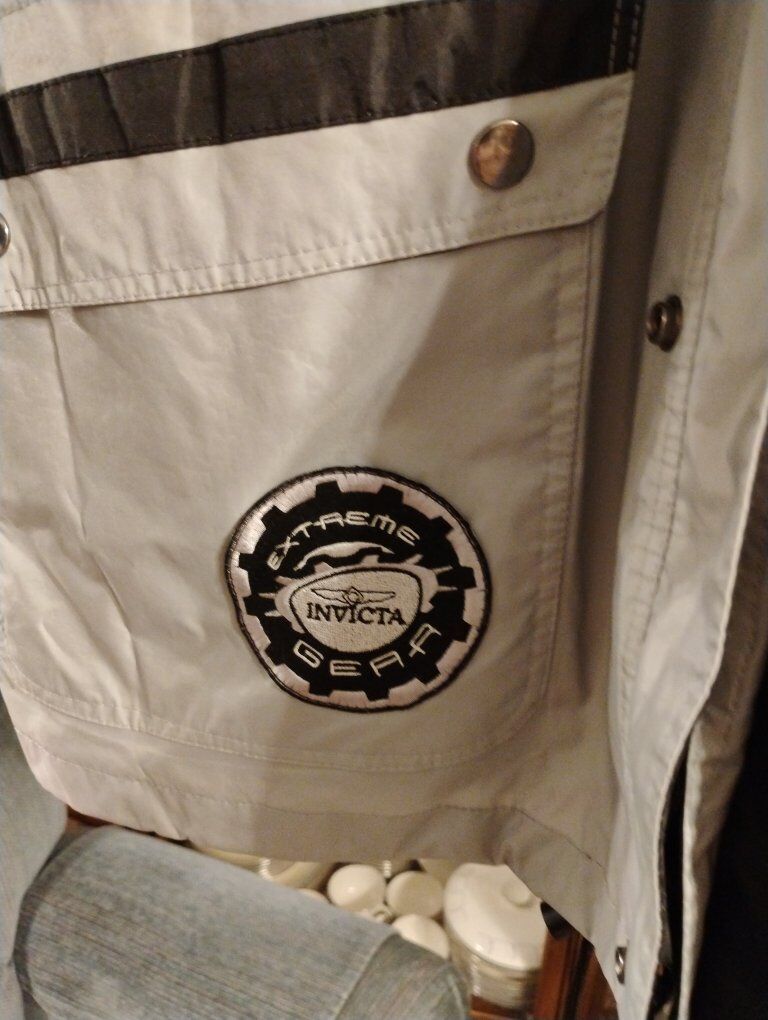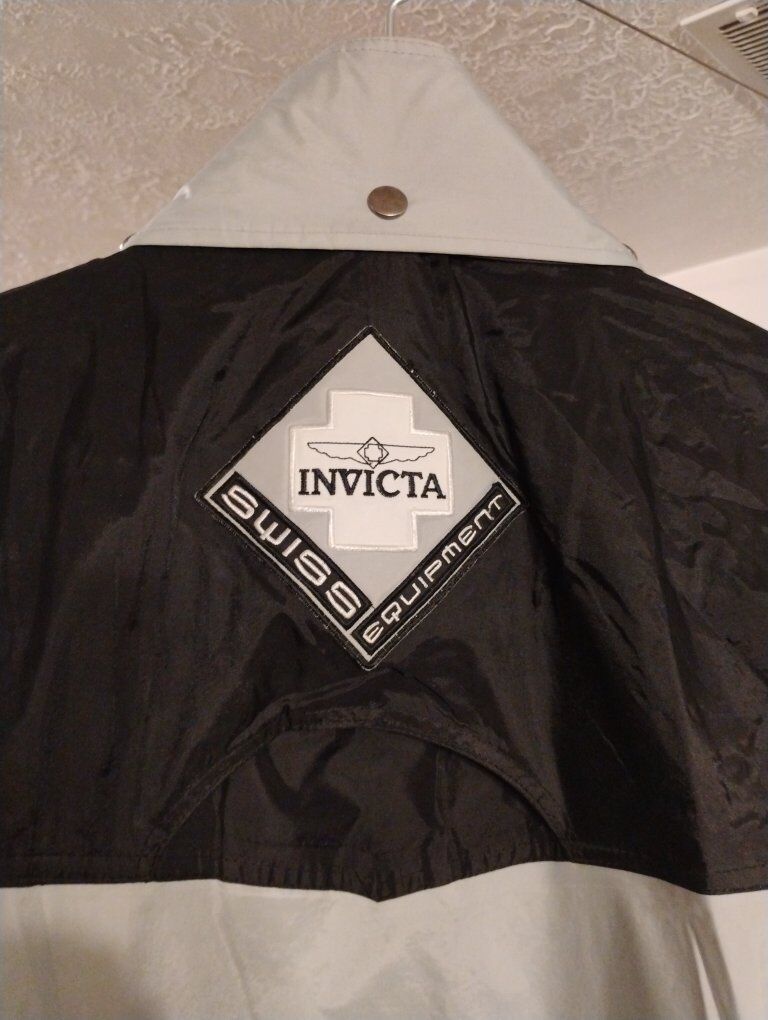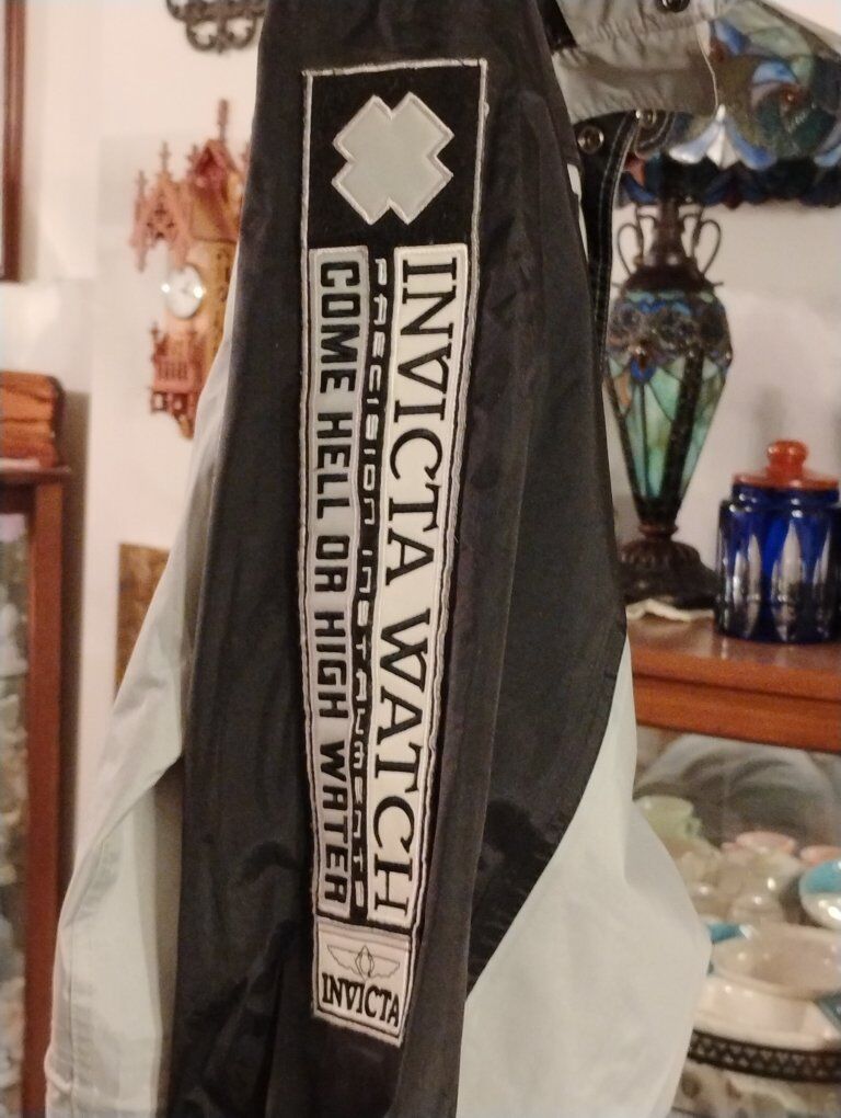 Invicta Watch Group Extreme Gear Jacket. Never worn, hard to find vintage jacket made in the early 2000s. Size 2XL, grey and black. 4 pockets on front of jacket, 2 lower with snaps, 2 upper with zippers, inner pocket in left chest, waist cinching pulls on front, zipper and snap button front, rolled up hood in snap collar. Invicta patches on left chest, right lower pocket, back of neck and right upper arm. Great for the Invicta collector or watch enthusiast.