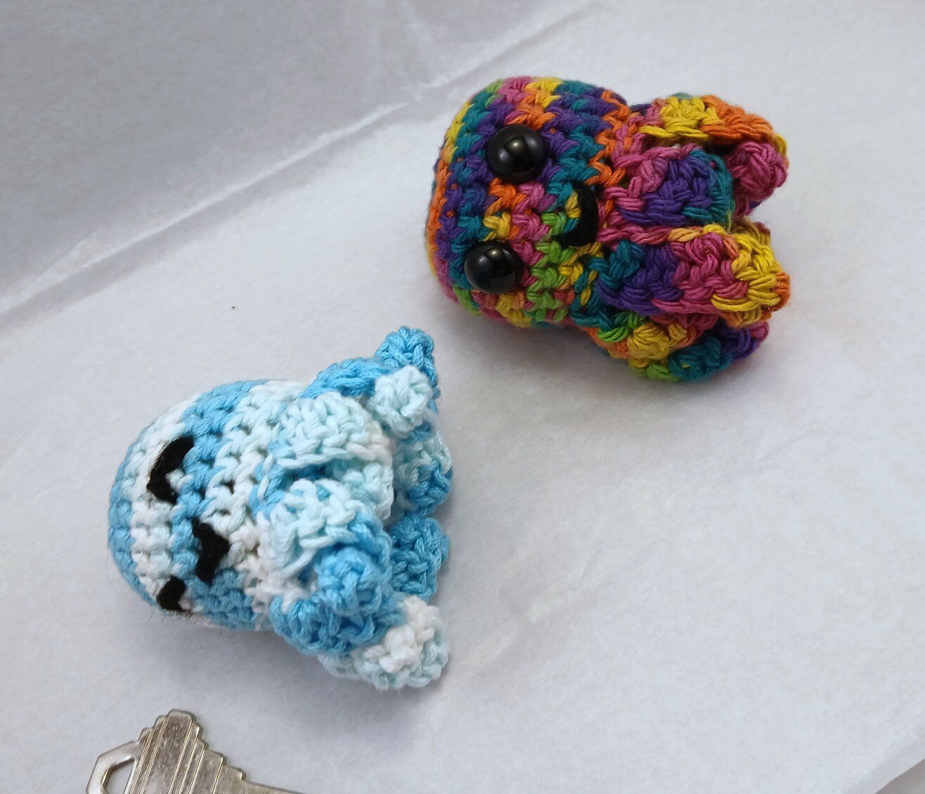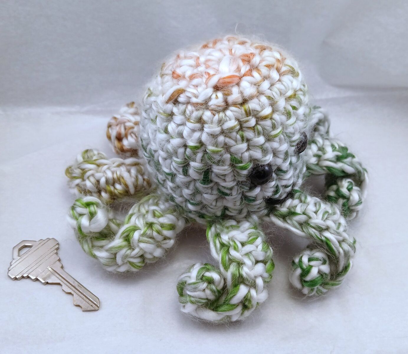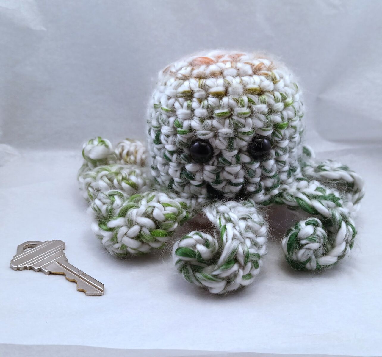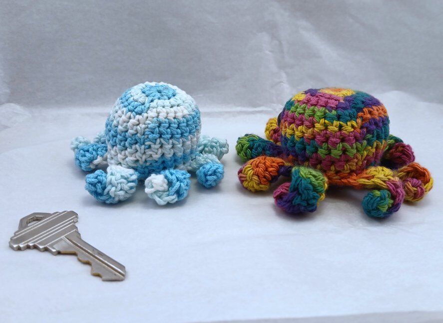 VenmoOctopus stuffed animals, crocheted and ready to be a keychain, desk toy, or stocking stuffer. House key for scale. Machine wash and dry on cold delicate. Blue and white octopus measures 1 3/4 inches tall and the same wide. Rainbow octopus measures 2 inches tall and 2 1/4 inches wide (just the head). Large octopus measures 3 1/4 inches tall and the same wide (just the head). $5 for the large one, and $3 each for the small ones. Cash or venmo. Check out my other listings!