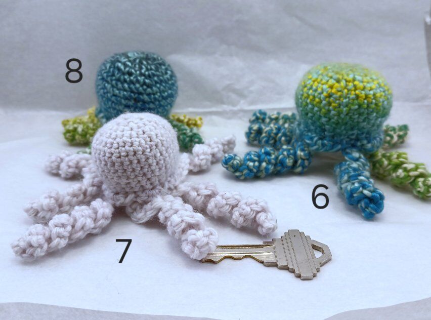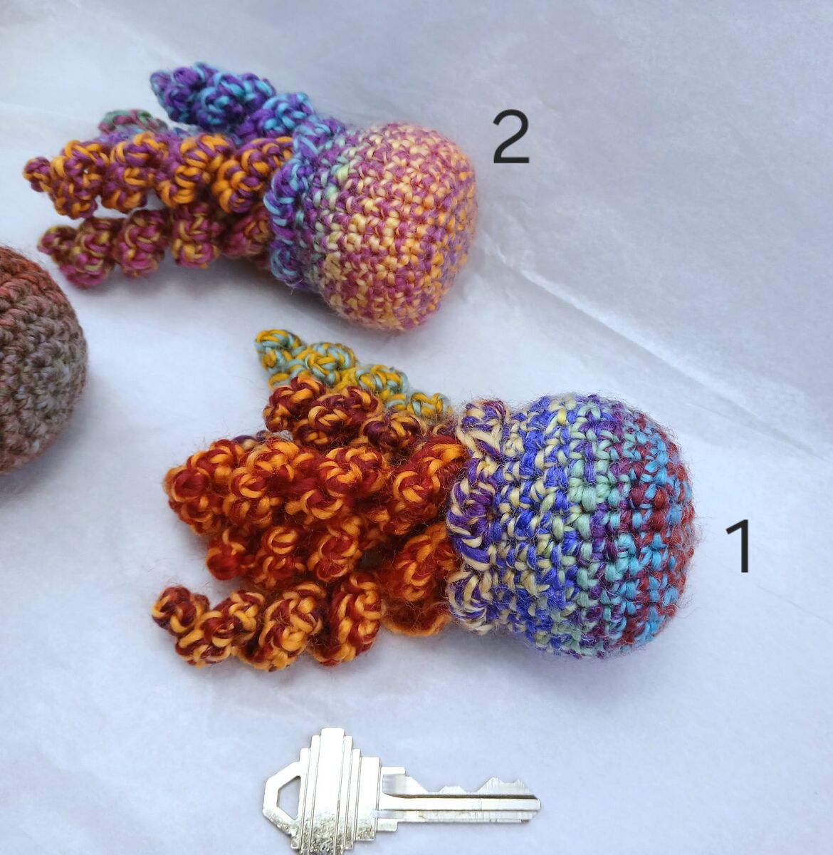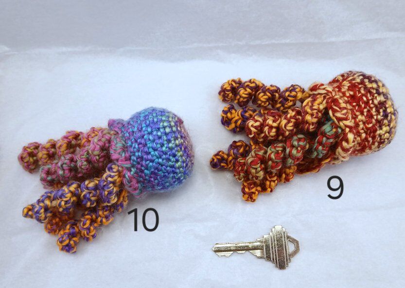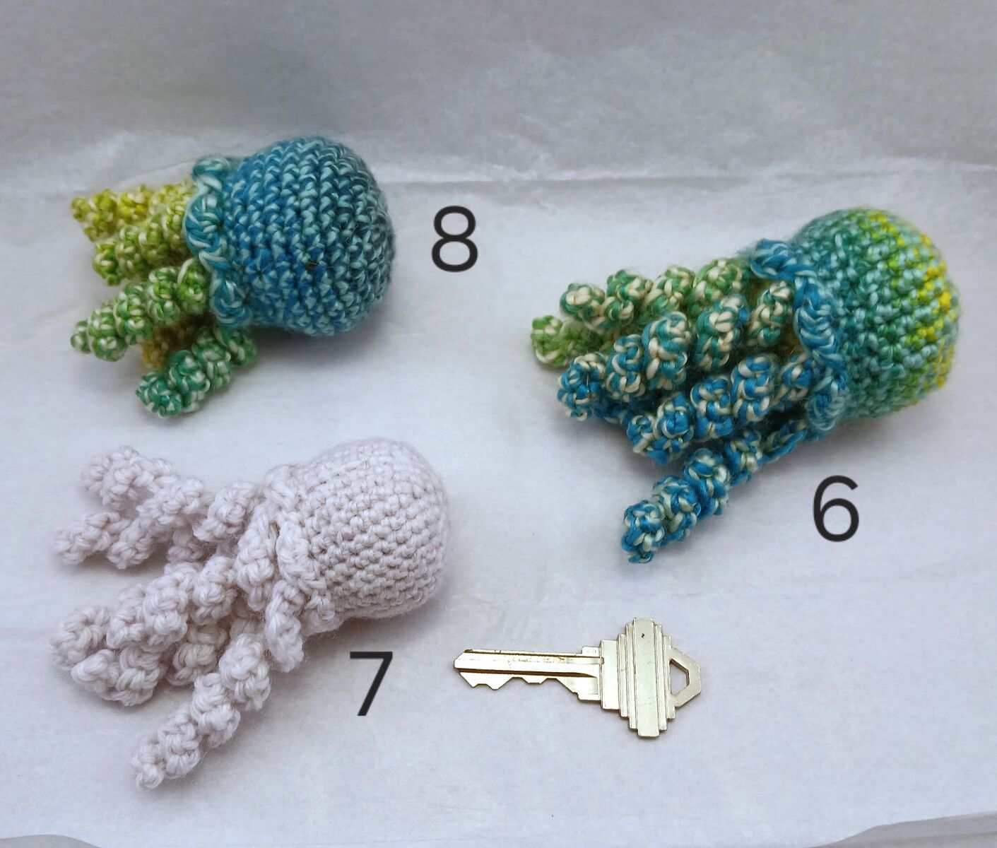 VenmoLittle jellyfish ready to brighten a keychain, desk, baby mobile, or as a fun gift. The larger ones measure about 4 1/2 inches tall with the head about 2 inches wide. House key for scale. Machine wash and dry on cold delicate. $3 each, cash or venmo. Check out my other listings!