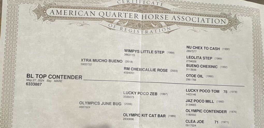 BL Top Contender is a 2024 bay filly by a son of Wimpys Little Step. Shes halter broke and a kind filly. She’s coming two and will be ready to start in a short couple months. She should mature to 15h. Nice filly with lots of potential! Would be open to trading for the right broodmare