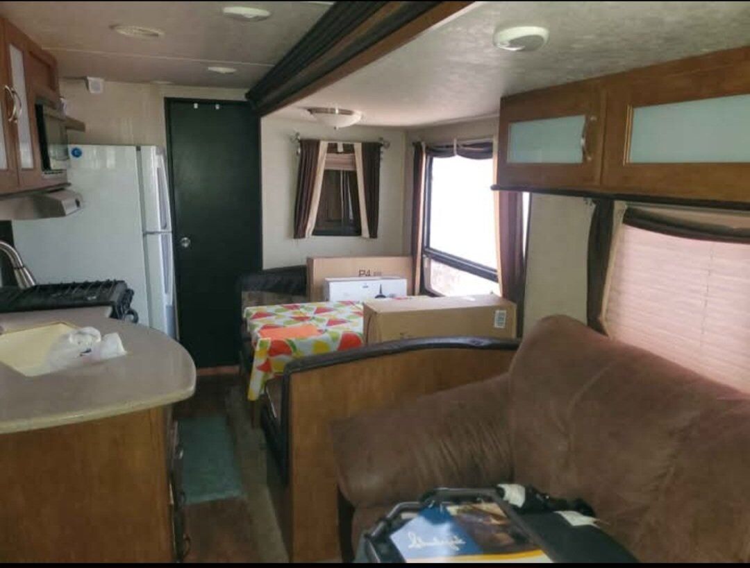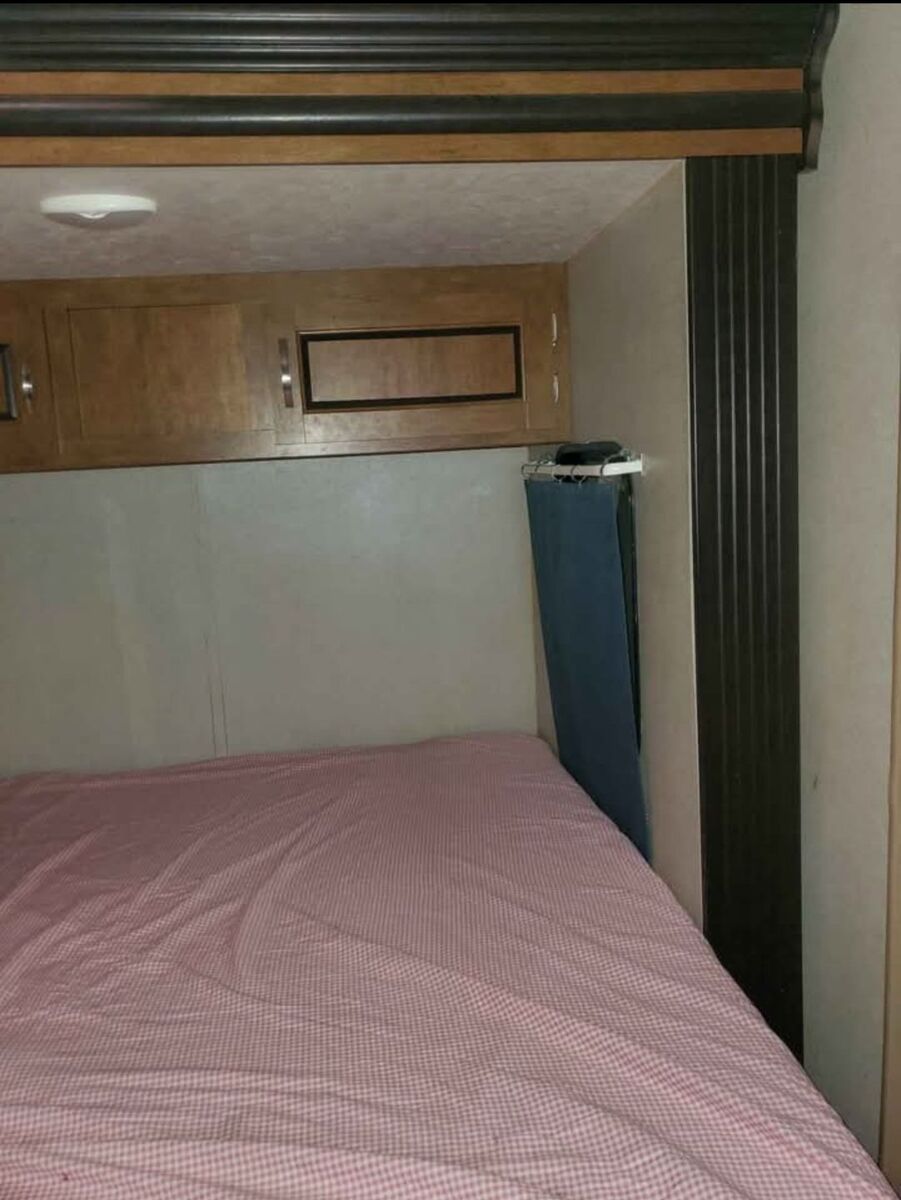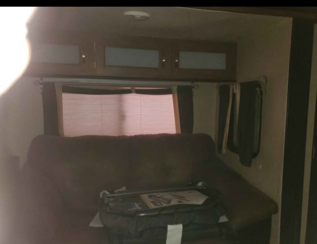 This is a 32-34 ft. Hitch camper trailer some of the features it has two exterior doors, a queen size bed, 2 bunk beds it will sleep 4 in the front part of the cabin there is a bathroom sink, shower, and toilet, washer/dryer combo, kitchen sink, kitchen table, couch, it also does have air conditioning and a heater unit, runs on propane battery and a generator, plenty of storage, I can't quite remember what other features there are if you have a questions message me and ask I will do my best to answer it.
