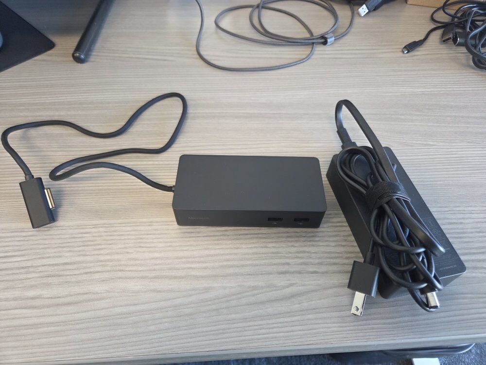 The Surface laptop docking station has multiple additional ports, ethernet, charging, and dual display outputs through the same magnetic cable as the charger.