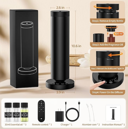 Smart Scent Control at Your Fingertips: Adjust intensity settings(L, M, H), time settings(2H,6H,12H,24H/7), and personalize your experience using the intuitive touchscreen or handy remote. Create the perfect ambiance in just one tap