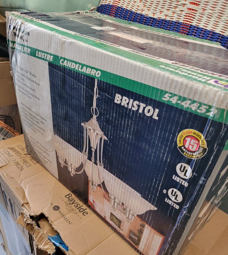 VenmoBrand new in box 5 light Chandelier by Hardware House Bristol. Model # 544452. Uses 5 60-Watt bulbs. 3 feet chain length Dimensions 20.5"L x 9.5"W x 14.75"H