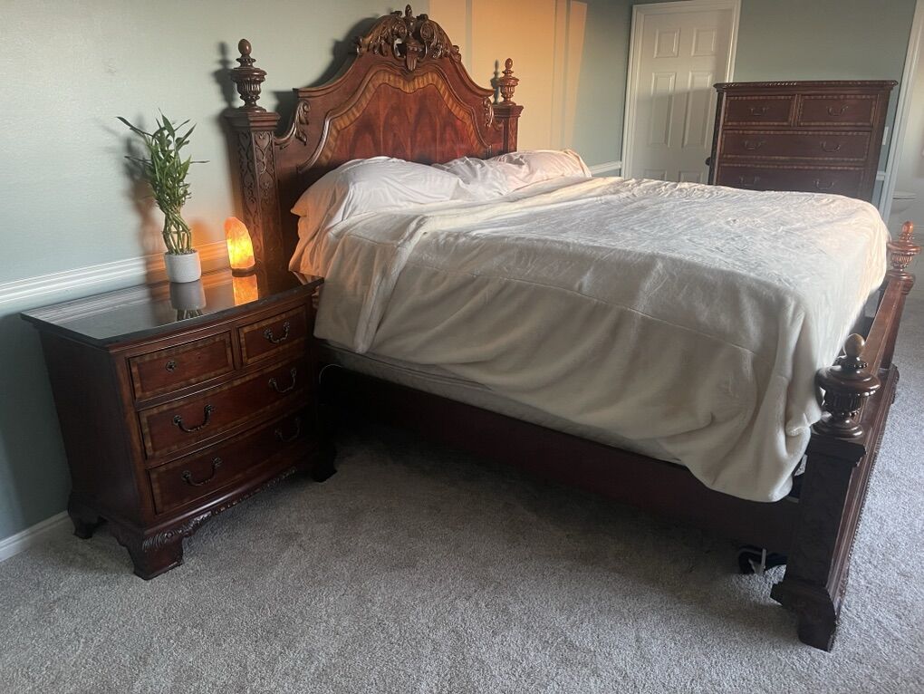 King size old world, European style four post bed, headboard, and footboard with rails and frame/supports.
