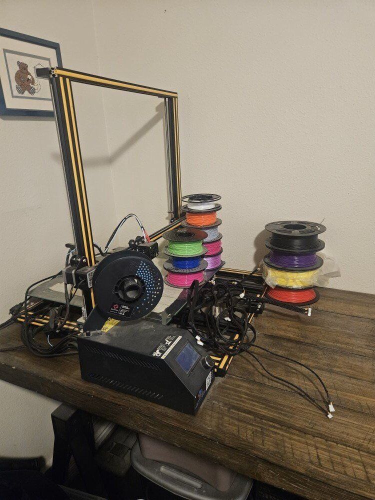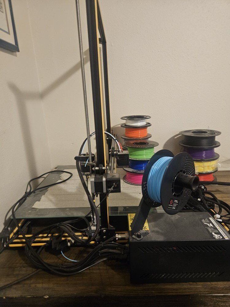 Creality CR10 S5. Includes all the different colors of filament shown in the picture. Also includes control box extension cords.