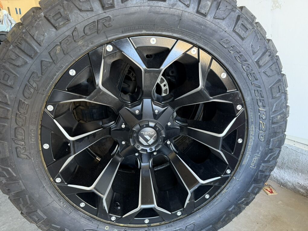 ZelleBrand new never used nitto ridge grapplers tires size LT305/55R20. With 20 inch Fuel D546 Assault Black Wheels 33 tires. 8 lug. Load range F. 8x180 Black rims.