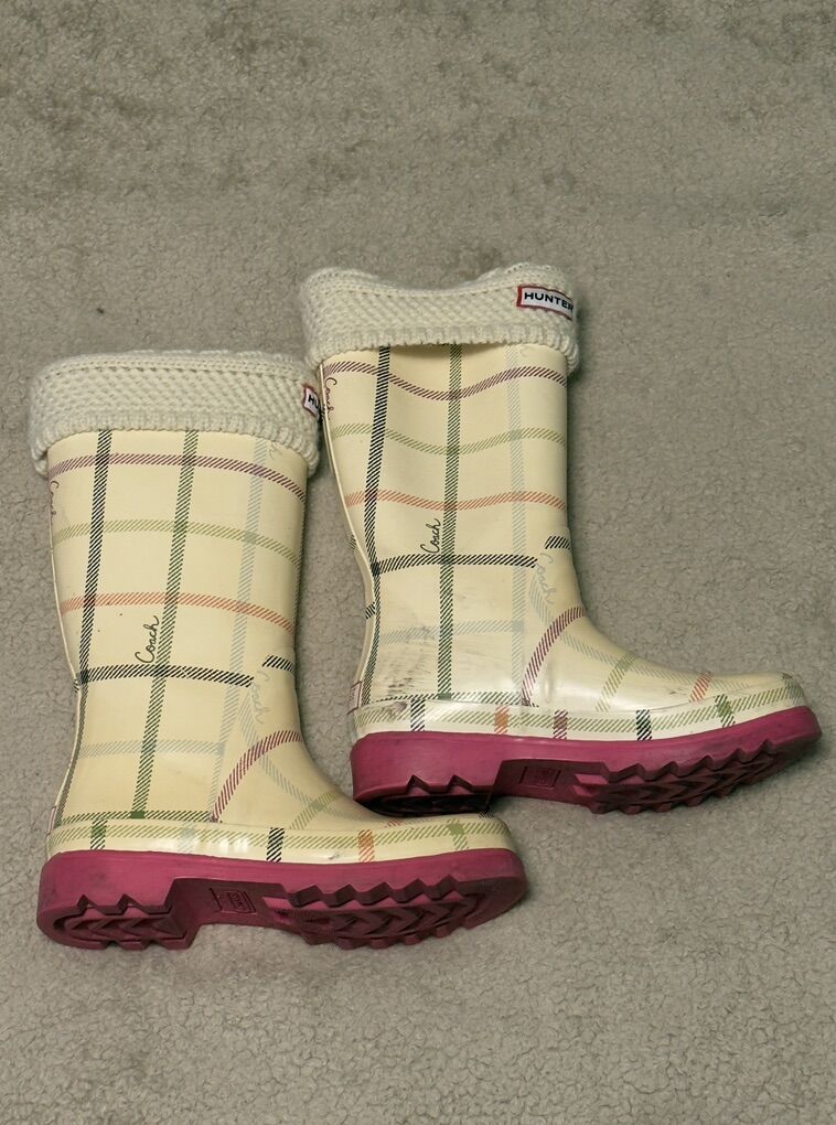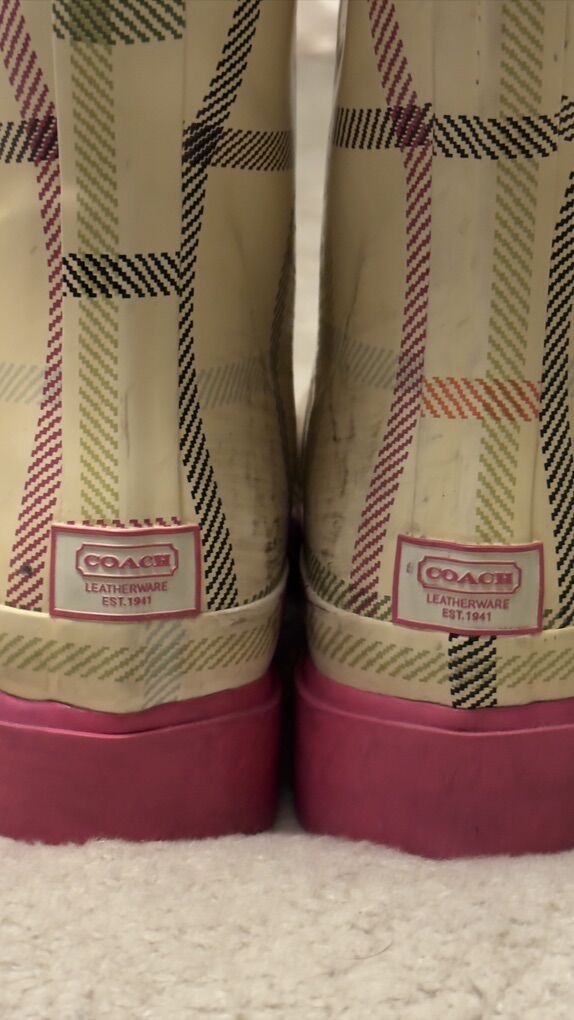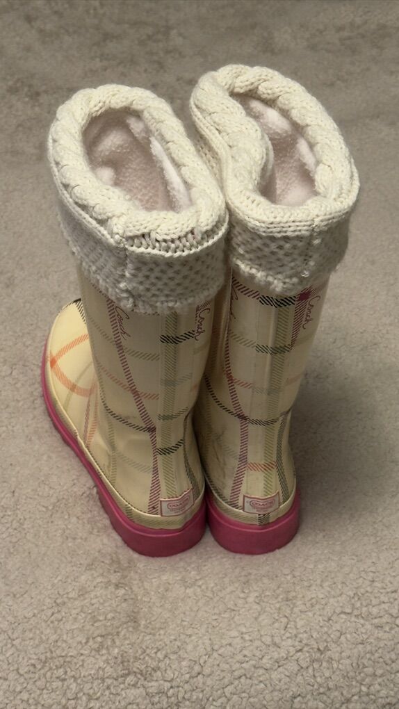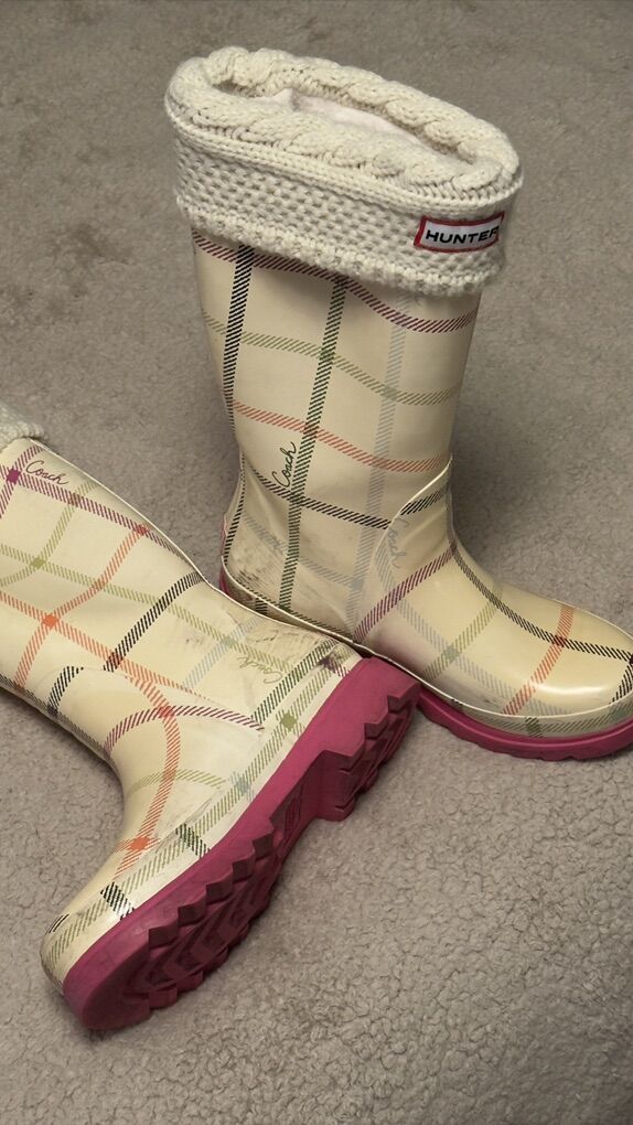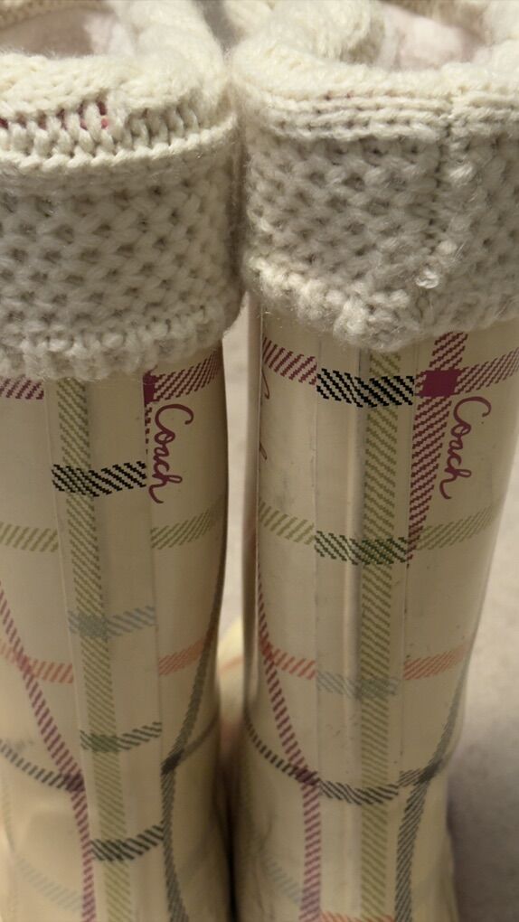 Description: Selling a pair of Coach paisley plaid rain boots (size 7M) with matching cream Hunter fleece boot socks (size M/M, cable knit cuff).