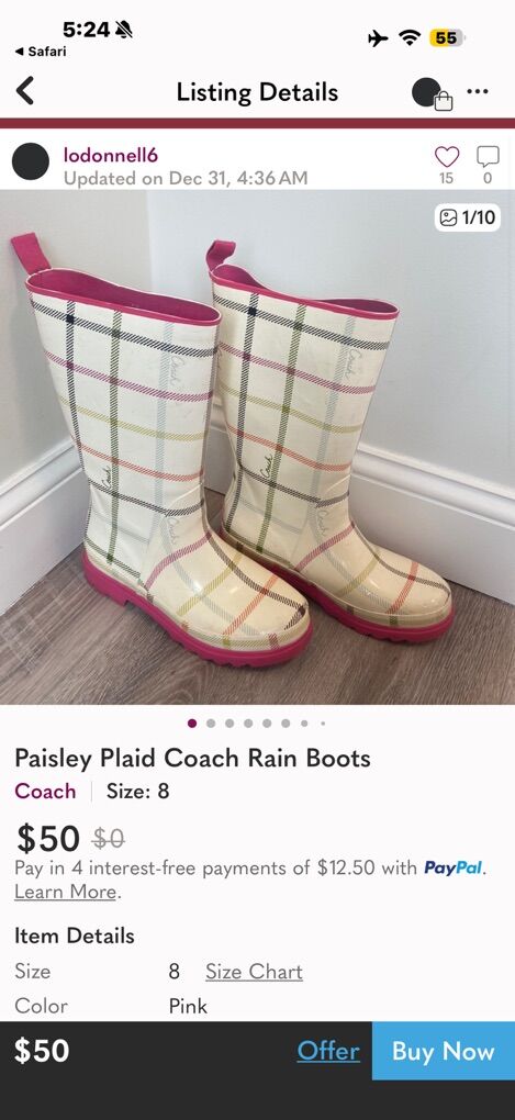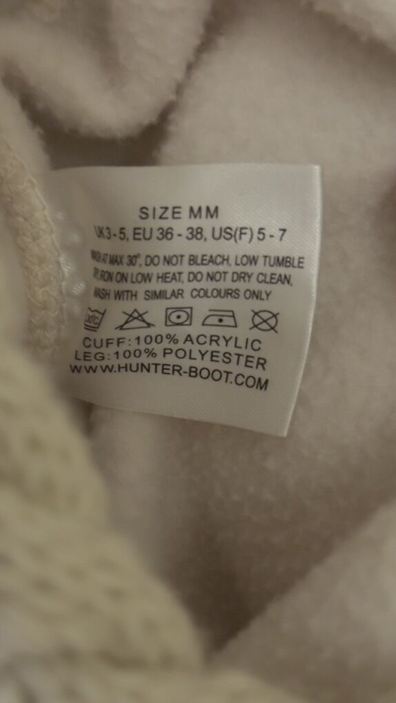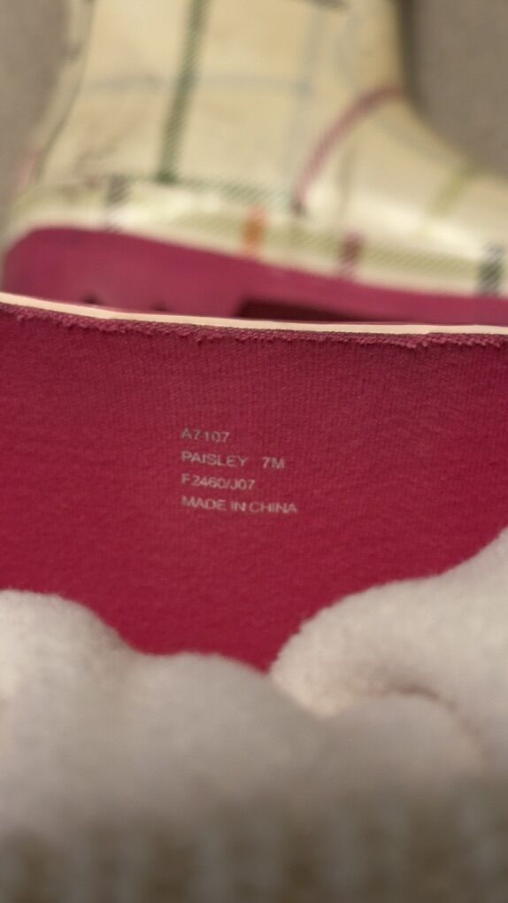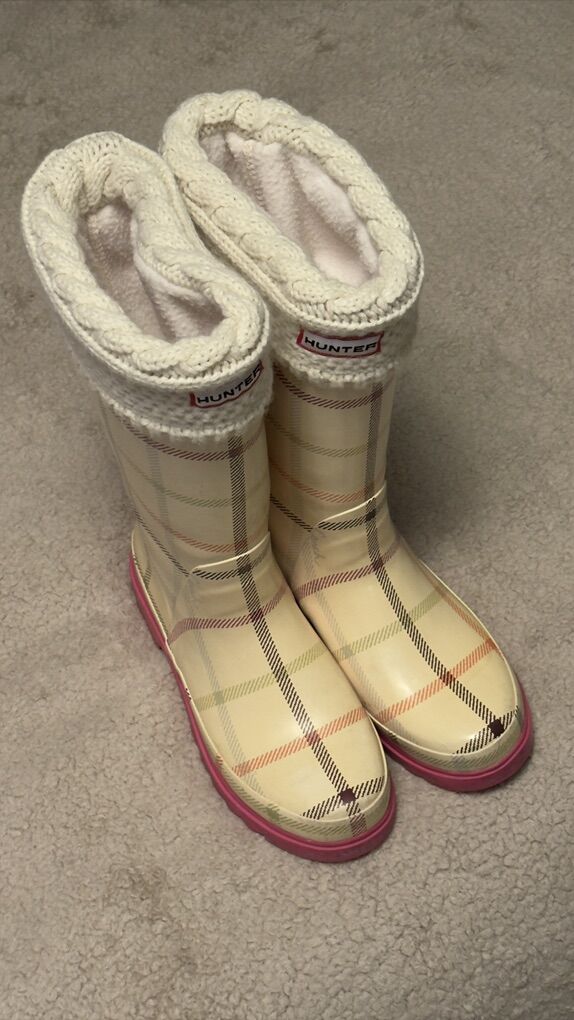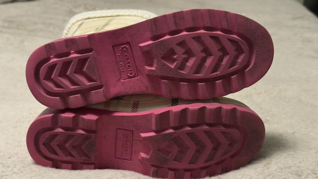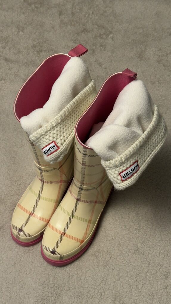 Description: Selling a pair of Coach paisley plaid rain boots (size 7M) with matching cream Hunter fleece boot socks (size M/M, cable knit cuff).