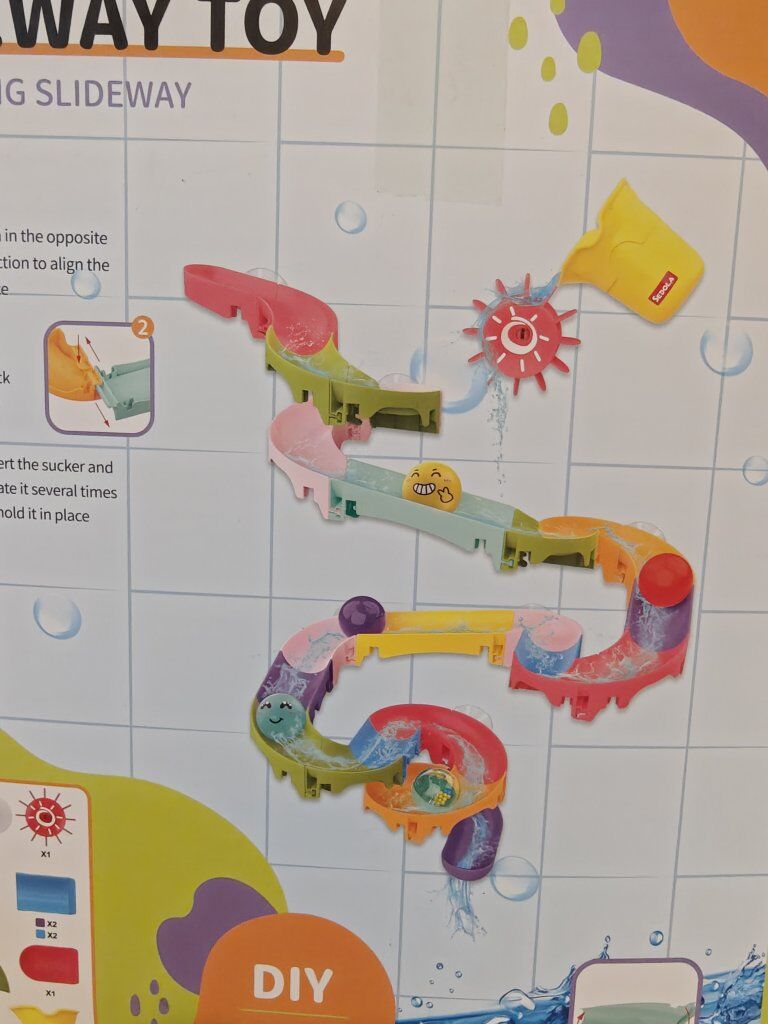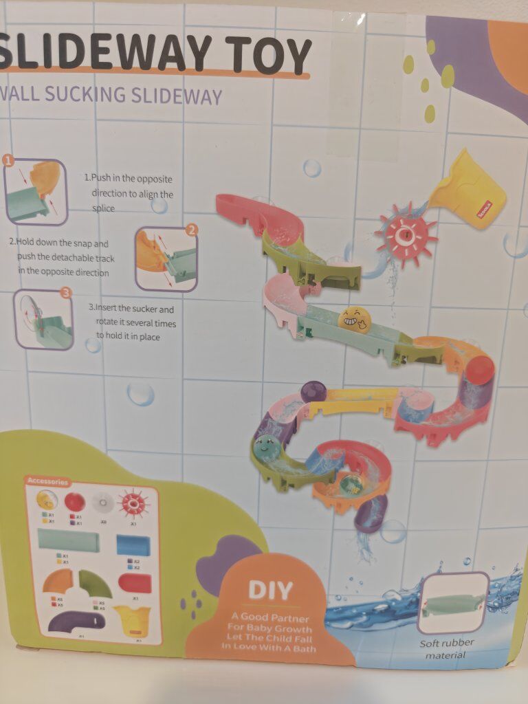 A new bath toy, it's a really cool toy. My daughter has one just like it, but it's smaller, and she enjoys bathing and playing with it, sending water and toys down the trampoline.
