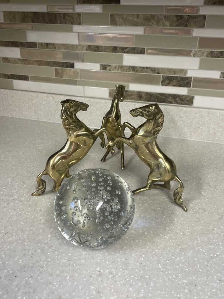 VenmoVintage Brass 3 Horses rearing statue stand with crystal orb.