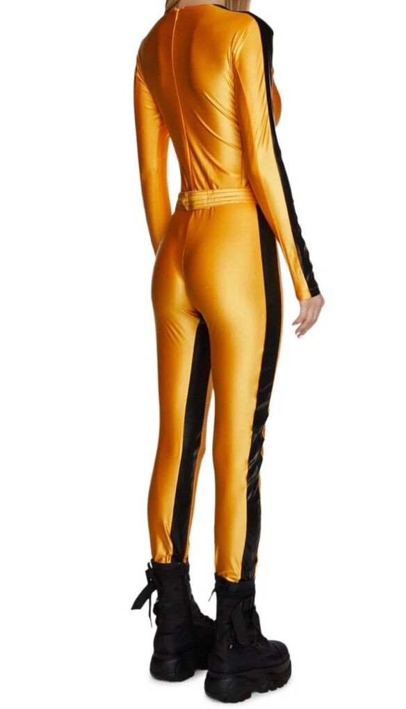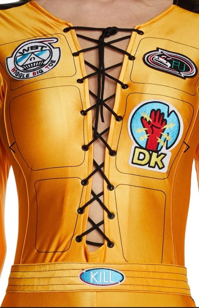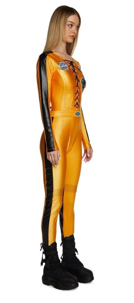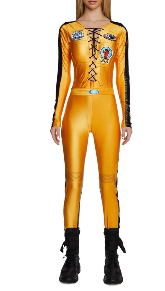 The product is a Dolls Kill Black Mamba Kill Bill Size Small Costume, inspired by the character from the movie Kill Bill. This cosplay costume features a yellow color and is designed for a Halloween theme. Made in China, this women's costume is perfect for a show or dress-up occasion, representing the iconic Bride character in a unique and stylish way.