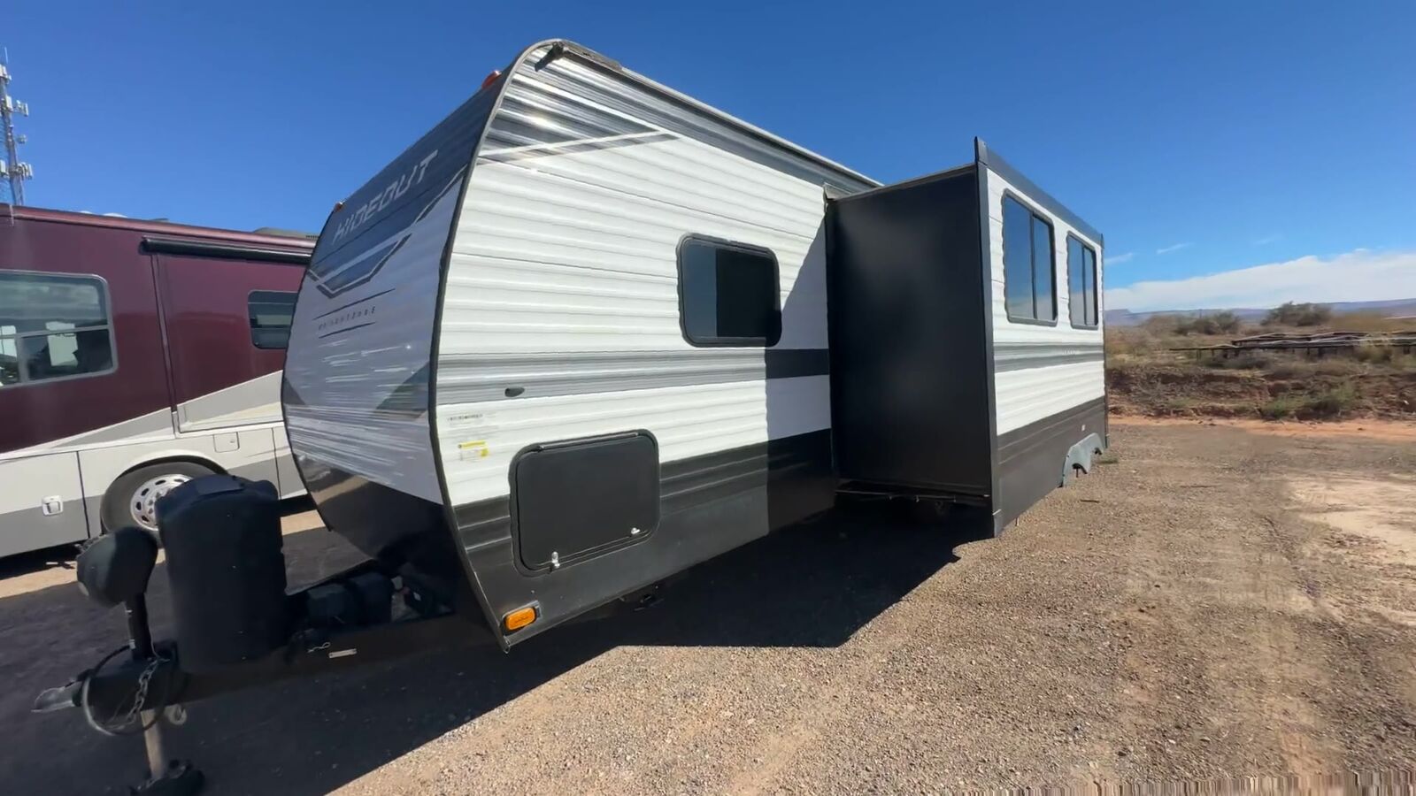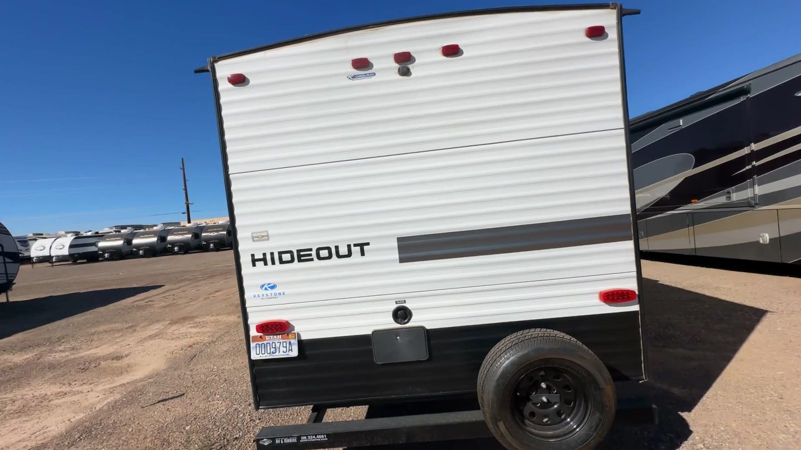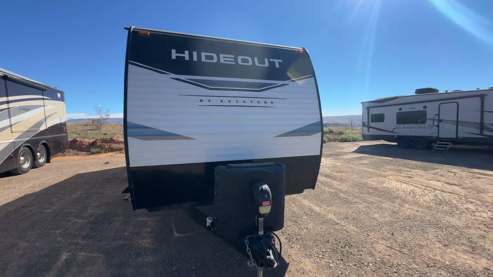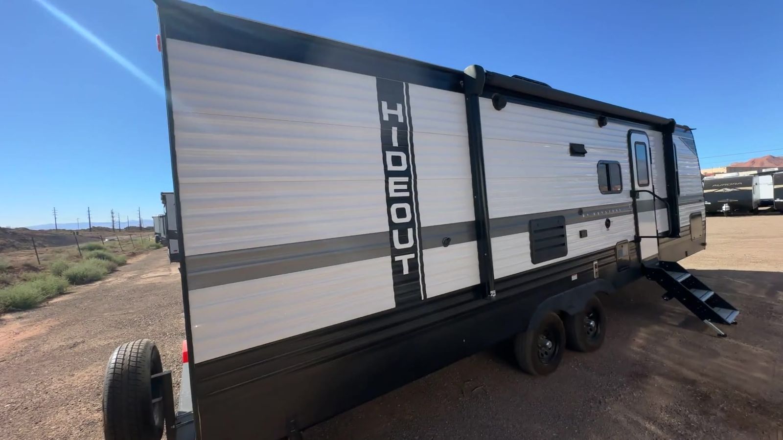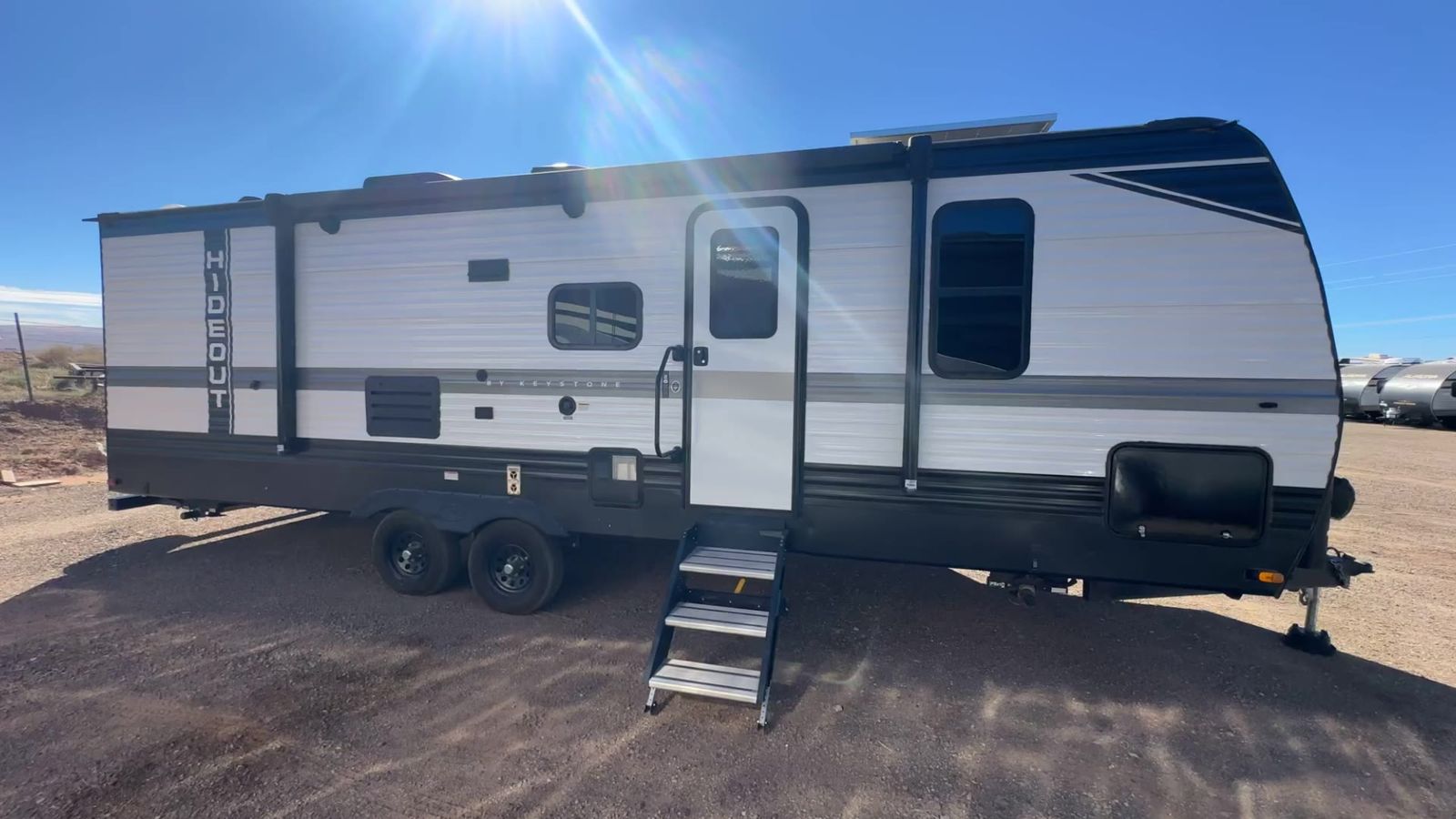 Keystone Hideout travel trailer 26BHWE highlights: Front Private Bedroom Rear Corner Bathroom Jackknife Sofa Fireplace Double-Size Bunks Welcome to your new Hideout travel trailer! It has a great layout ready for a full family or group of friends. The front private bedroom gives you a queen bed that you can rest on each night, and the laundry chute will help you keep your dirty clothes hidden. The large slide in the main living area holds the booth dinette and jackknife sofa, and you'll be able to use these pieces of furniture as beds too. The 52" x 74" bunk beds have a privacy curtain that you can draw when the kids are sleeping, and the 38" walk-in shower is ready to keep all of you clean. You can also add an optional 40" HDTV to the entertainment center so that you can have a movie night whenever you want. The Keystone Hideout travel trailer, fifth wheel, and destination trailer will be just what the doctor ordered for a stress-free holiday at your favorite campsite! There are a few exclusive features that you'll only find on a Keystone product, like the color-coded unified wiring, the preparations for 4G LTE and Wi-Fi, the Tuf-Lok™ thermoplastic duct joiners, the in-floor heating ducts, and the Tru-fit™ slide construction. Each model has a power awning for some shade in the afternoon, and the tinted safety glass windows will prevent the harmful UV rays from getting inside. You'll also have blackout night shades that you can close when you want privacy, and the SolarFlex 200 is a solar power system that will refill your battery to operate onboard 12V systems with just one day of peak sun exposure.