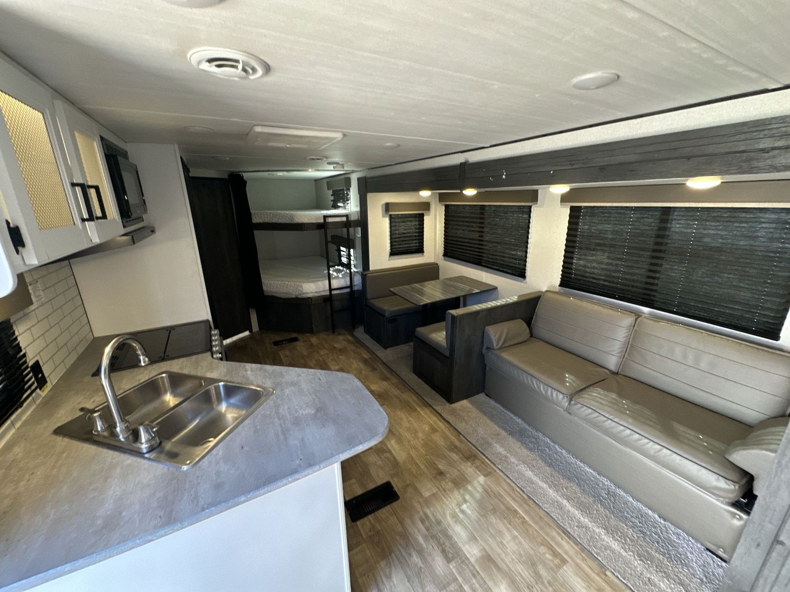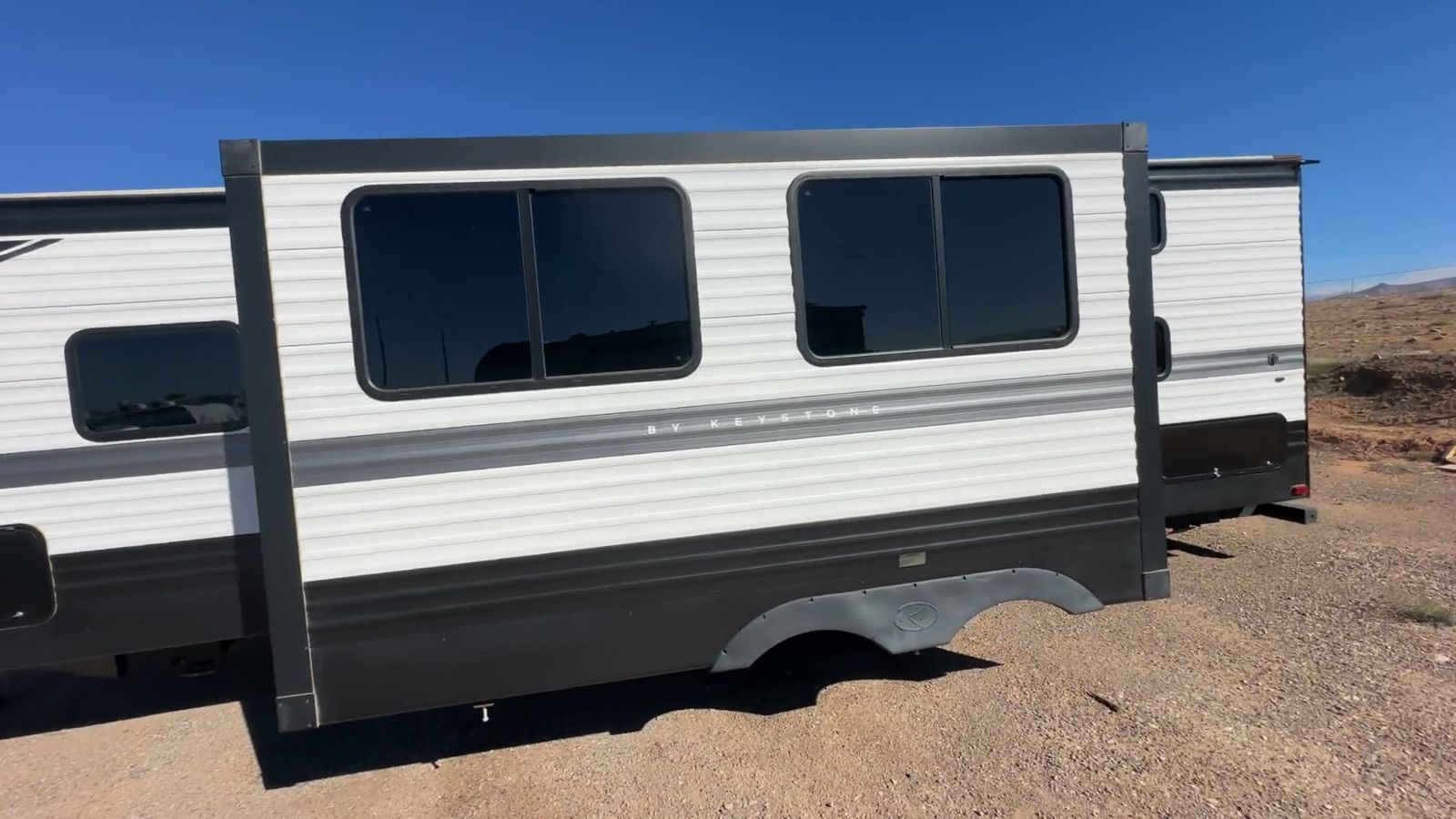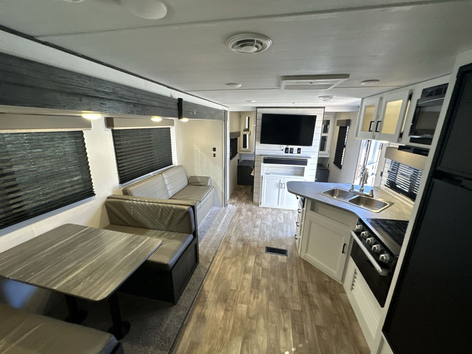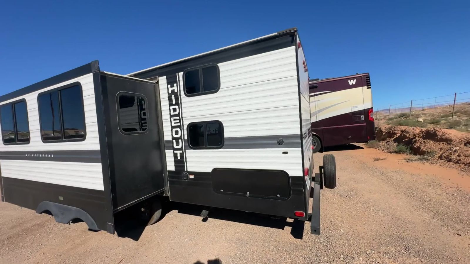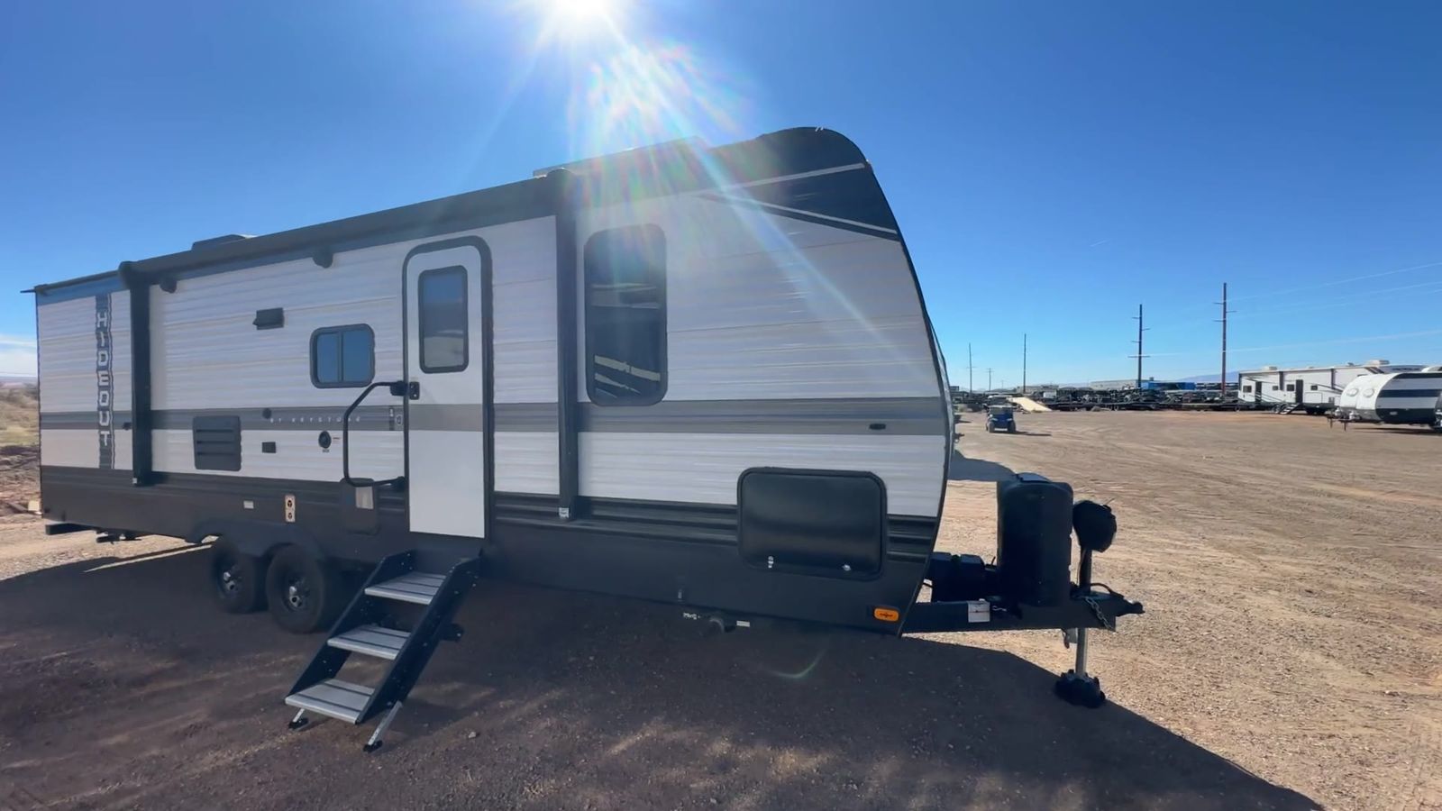 Keystone Hideout travel trailer 26BHWE highlights: Front Private Bedroom Rear Corner Bathroom Jackknife Sofa Fireplace Double-Size Bunks Welcome to your new Hideout travel trailer! It has a great layout ready for a full family or group of friends. The front private bedroom gives you a queen bed that you can rest on each night, and the laundry chute will help you keep your dirty clothes hidden. The large slide in the main living area holds the booth dinette and jackknife sofa, and you'll be able to use these pieces of furniture as beds too. The 52" x 74" bunk beds have a privacy curtain that you can draw when the kids are sleeping, and the 38" walk-in shower is ready to keep all of you clean. You can also add an optional 40" HDTV to the entertainment center so that you can have a movie night whenever you want. The Keystone Hideout travel trailer, fifth wheel, and destination trailer will be just what the doctor ordered for a stress-free holiday at your favorite campsite! There are a few exclusive features that you'll only find on a Keystone product, like the color-coded unified wiring, the preparations for 4G LTE and Wi-Fi, the Tuf-Lok™ thermoplastic duct joiners, the in-floor heating ducts, and the Tru-fit™ slide construction. Each model has a power awning for some shade in the afternoon, and the tinted safety glass windows will prevent the harmful UV rays from getting inside. You'll also have blackout night shades that you can close when you want privacy, and the SolarFlex 200 is a solar power system that will refill your battery to operate onboard 12V systems with just one day of peak sun exposure.