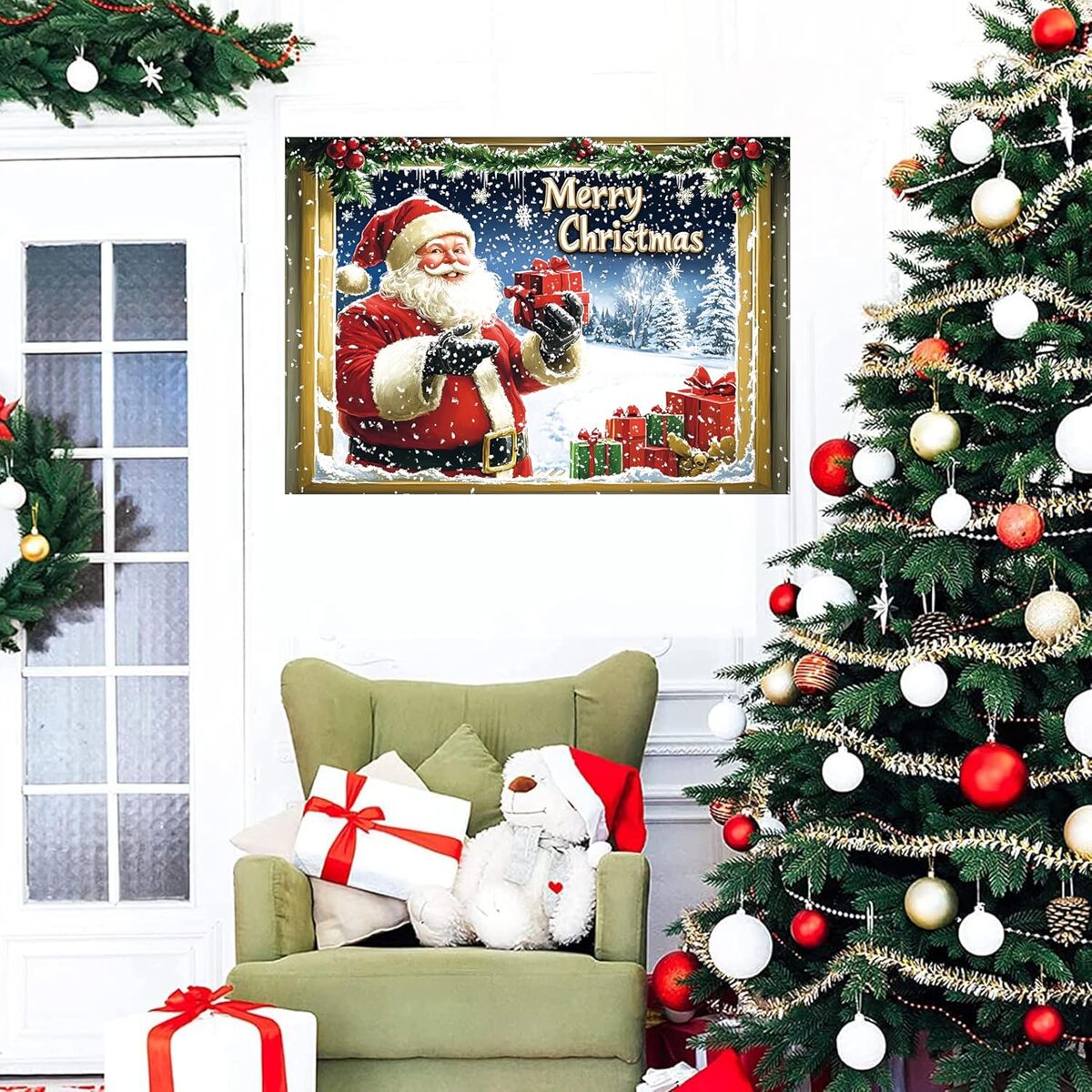 Holiday Spirit Unleashed: Brighten your space with our vibrant 3D Christmas Tree fake window and Santa Claus Wall Decor, bringing joyful atmosphere.