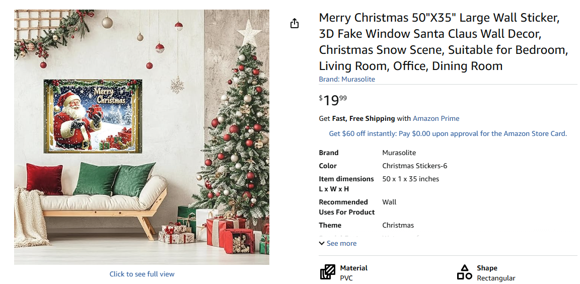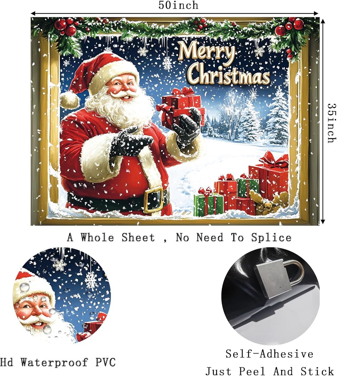 ApplePayMerry Christmas 50"X35" Large Wall Sticker, 3D Fake Window Santa Claus Wall Decor, Christmas Snow Scene