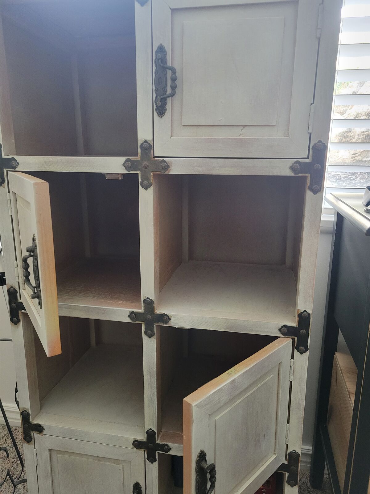 PayPalOff-while decorative shelf. $60 OBO Has 8 compartments, 4 of which have doors Dimensions: 46.5H - 22L - 14 W