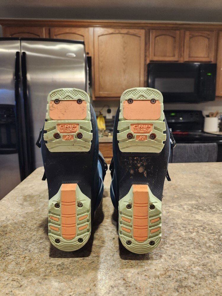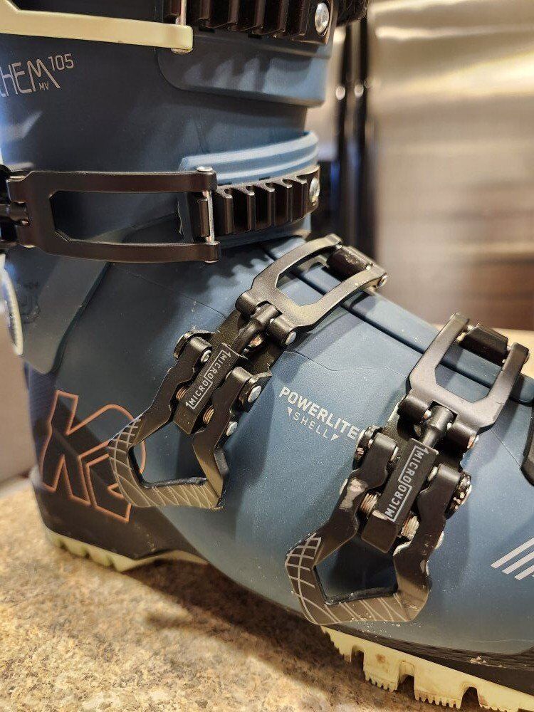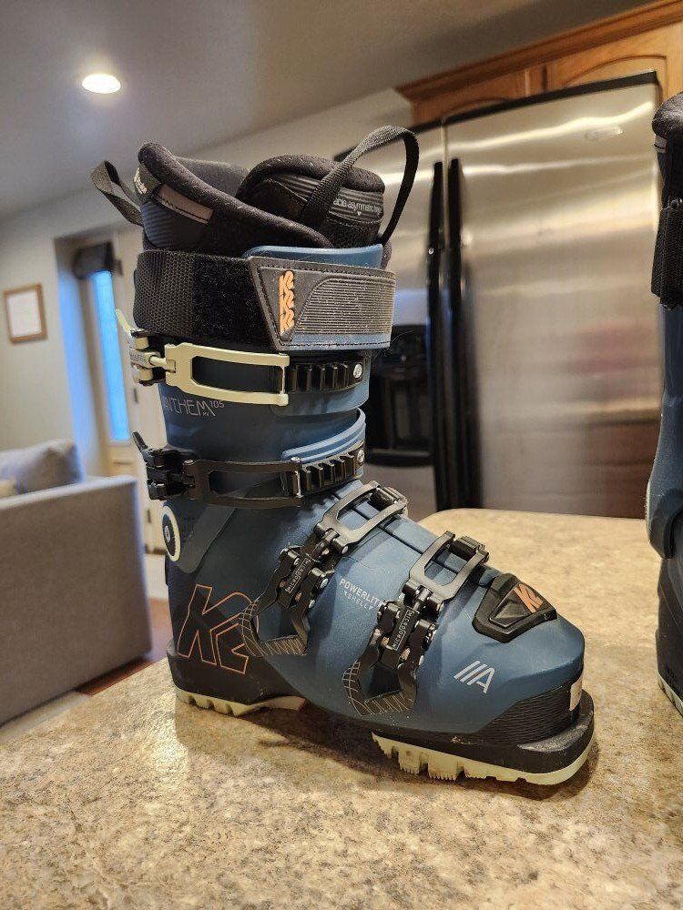 The K2 Anthem 105 MV is a women's-specific ski boot designed for skiers. It features a heat-moldable Powerlite shell for a customizable fit and GripWalk outsoles for better grip and comfort while walking. The boot has a 100mm last, which is a performance medium fit for people with normal width and volume feet. This model also features the BOA® Fit System for micro-adjustable precision.