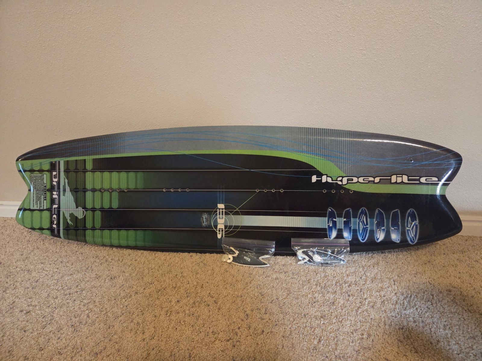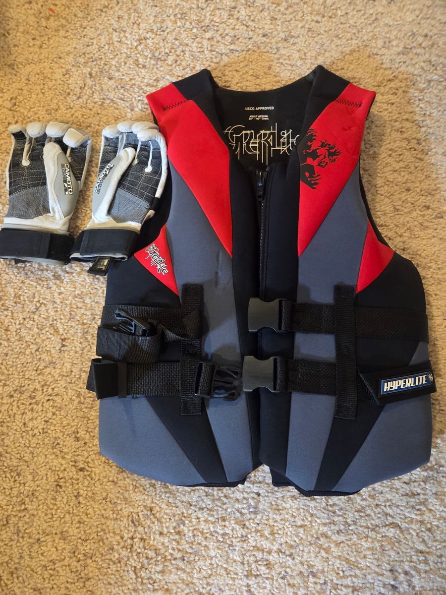 Green wake board 9 E. Comes with Camoto water gloves and adult medium life jacket.