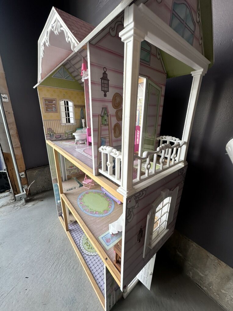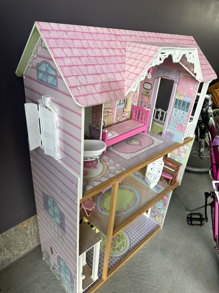 VenmoSturdy dollhouse with furniture. The roof is 33inches (widest part of the house), 46 inches tall, 13 inches deep.