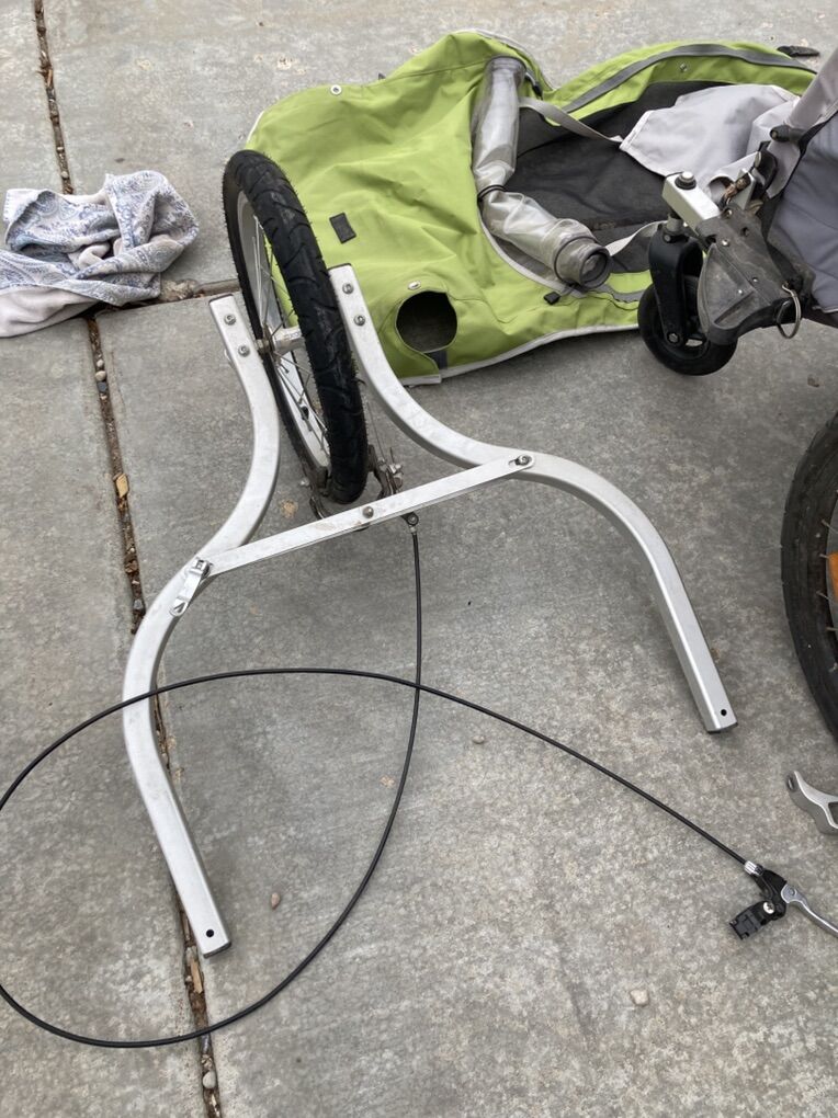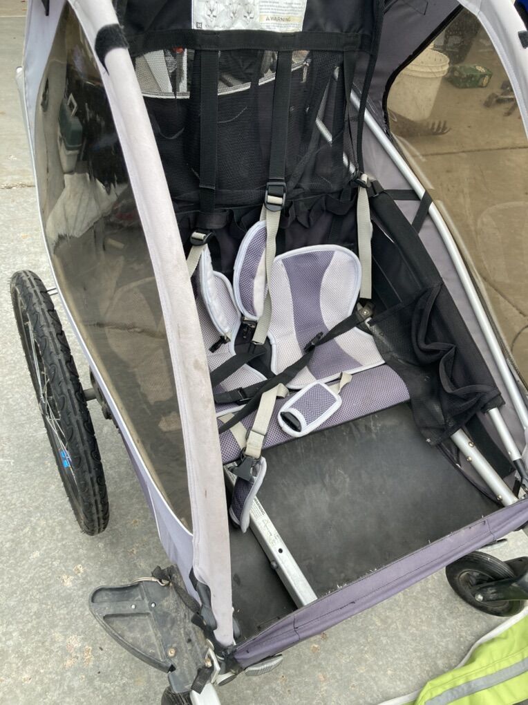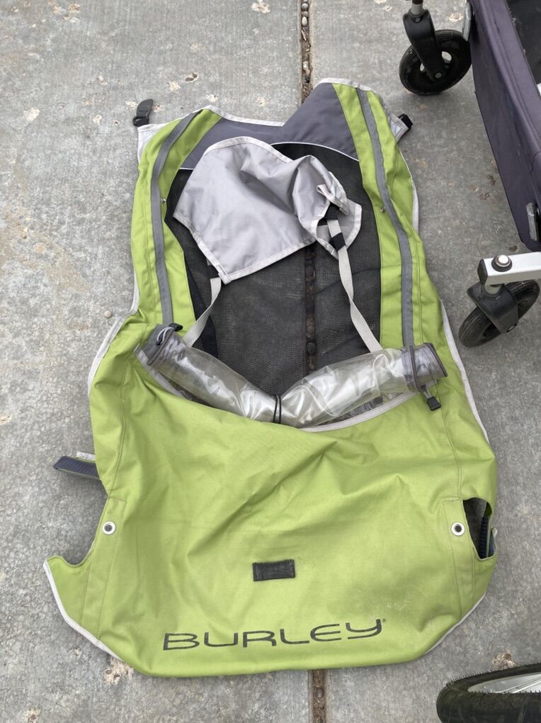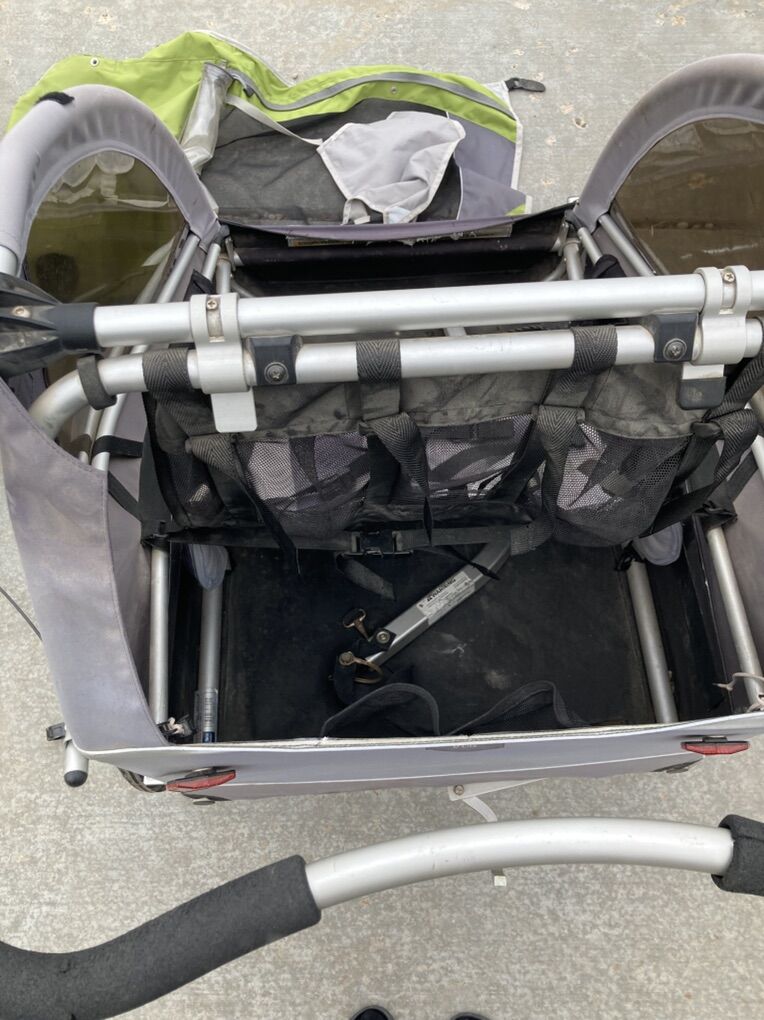 VenmoThis is a used Burley brand double stroller. It can be used for walking, jogging (jogging wheel) and comes with a bike attachment so you can tow it behind you. The cover (green) was replaced just a few years ago. It worked well for us and now our kids are grown. $125 and firm. This is a steal of a deal, but I need it out of the garage.