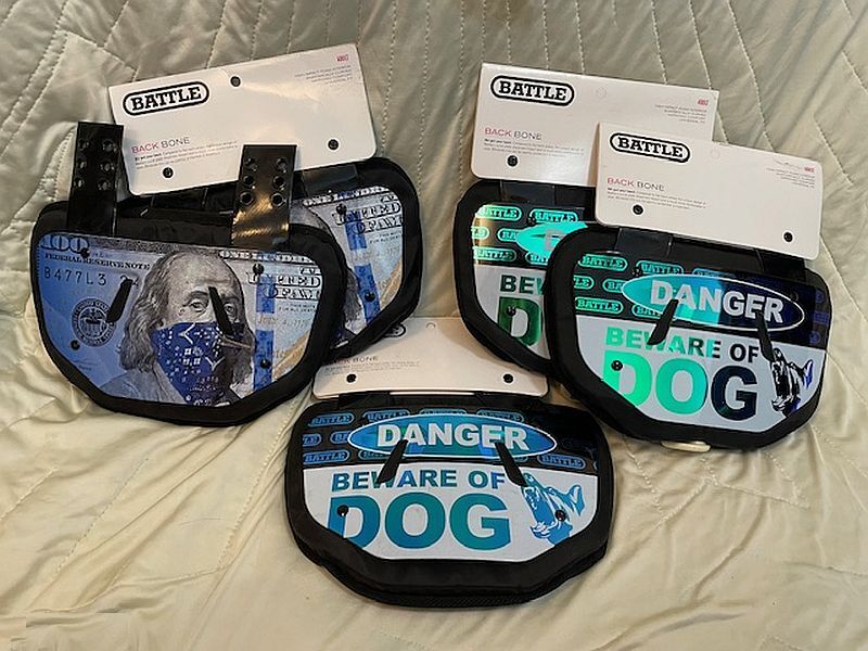 The new Battle Blue Strips Back Plate, is designed to deliver maximum protection and comfort to players of all ages. The Battle Back Plate absorbs impact and provides reliable protection to your back region. Compared to flat football back plates, the unique design of Battle’s curved plate disperses impact and is much more comfortable to wear. Our strong attachment straps keep this football back flap close to your back.
