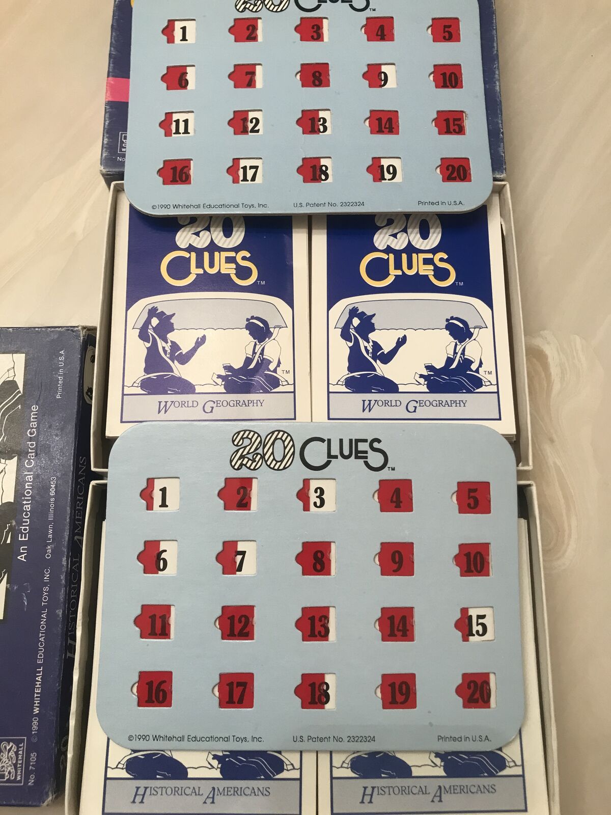 20 Clues World Geography Card Game 1990 ~ Whitehall Educational Toys, Inc. Ages 10 and Up. Box measures 7 1/2 x 5 1/2 inches. In good used condition. Box has some scuffing and corner bumping. The cards and score keeper are in good condition. Please see photos for condition detail. "The card game that tells all about the U.S. and the world! Learn about major historical facts and the people behind them. Increase your knowledge of the world's physical features! Can be played with 1 or more players and in teams." Neat addition to any home school or vintage card game collection~