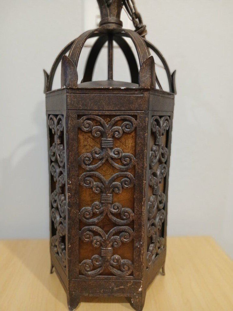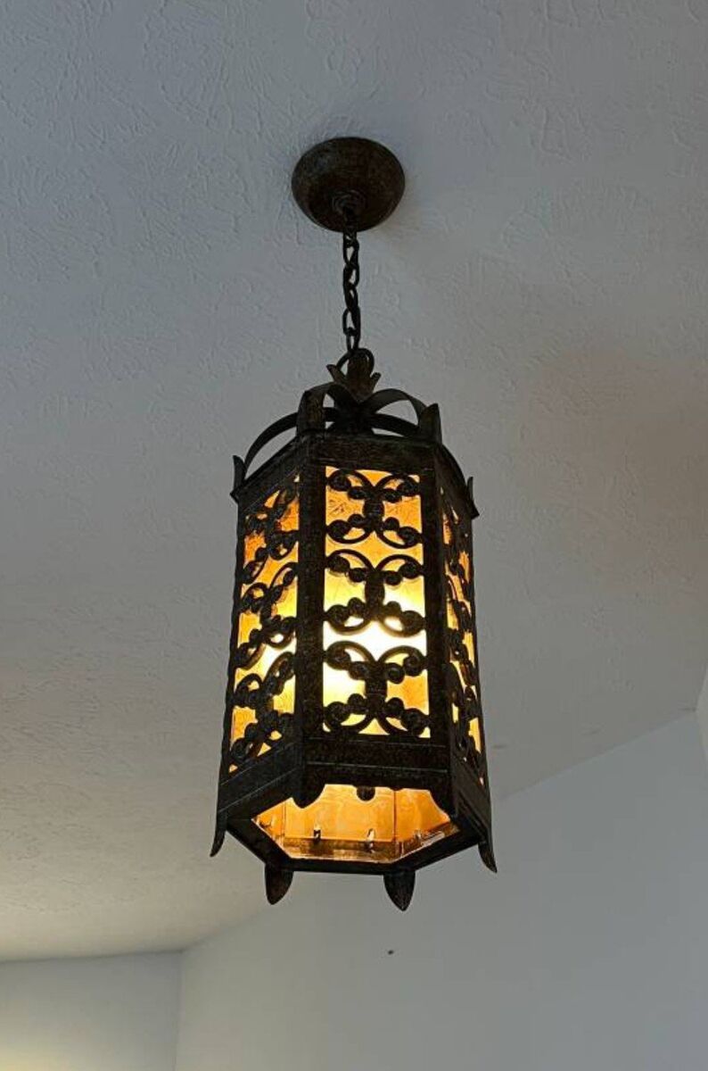 large heavy 17 lbs 22 x 9.5 inches hexagonal cathedral revival wrought iron and glass 3-light pendant lamp