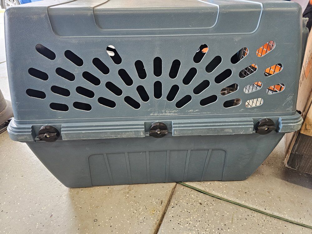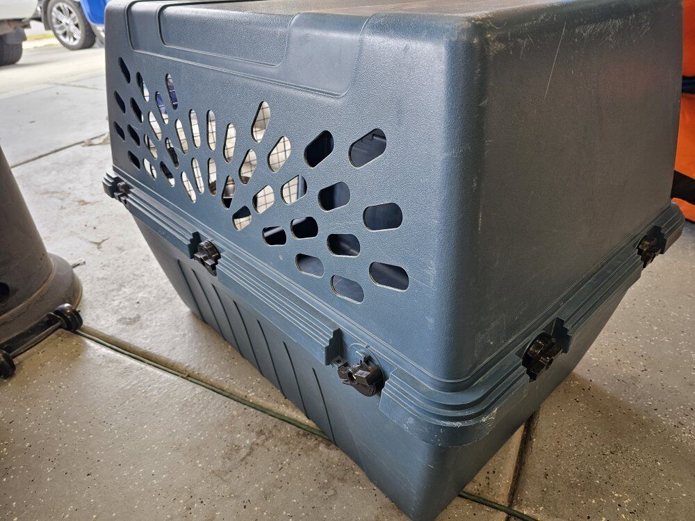 Venmoused plastic dog kennel with dish attachment