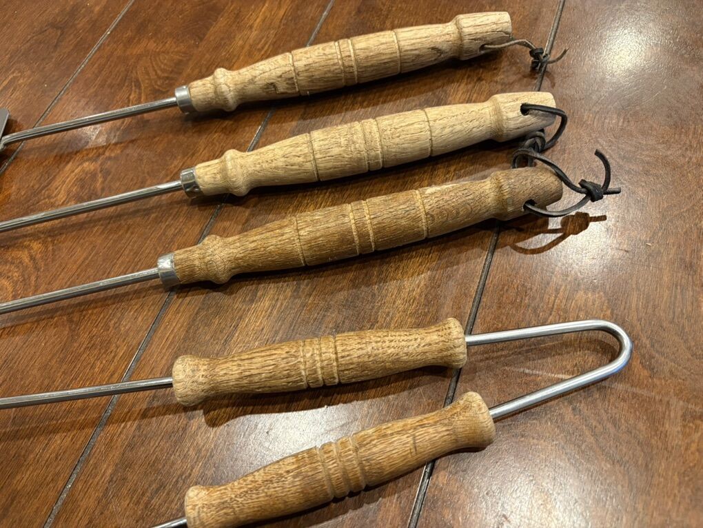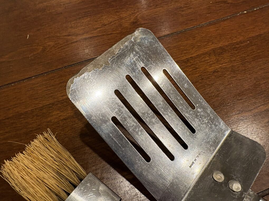 I have an older set of barbecue grill tools of utensils with wood handles. There’s a spatula, tongs, fork and brush. They’re in pretty good condition but the silver on the edge of the spatula has worn off (see the last picture). See my other ads for jewelry, artwork, home decor and more.