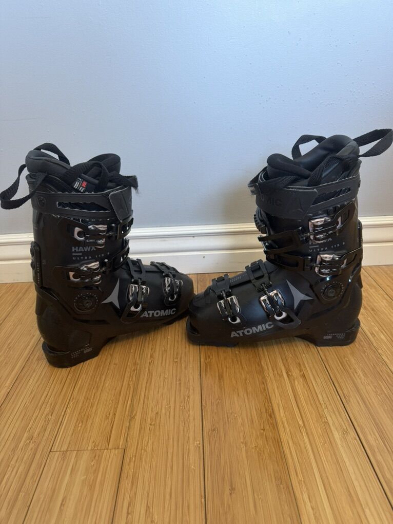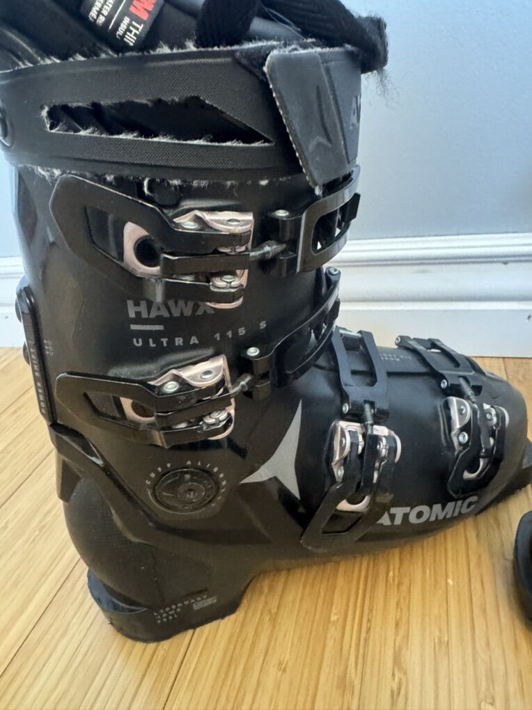 $699 retail Atomic Hawx Ultra 115 25/25.5 Womens 290 BSL size 8-9 96 last (narrow) 115 flex (intermediate/advanced) Excellent used condition, est 30 days Rose gold buckles Downhill/alpine/resort boots, not for touring/backcountry skiing Gripwalk soles