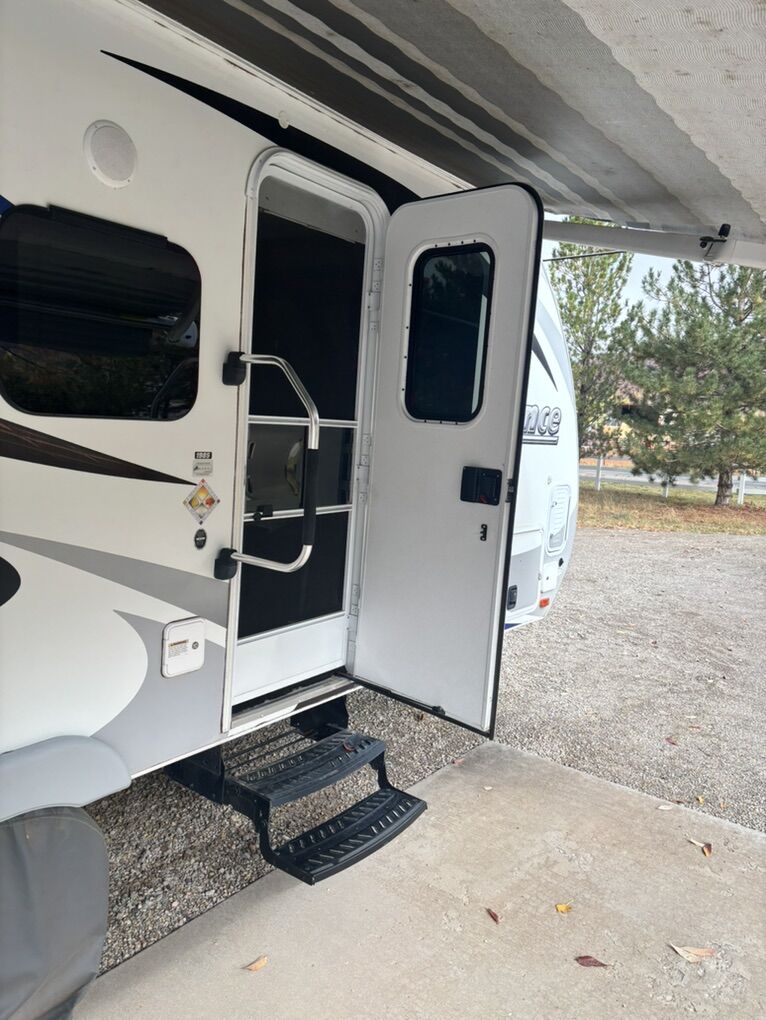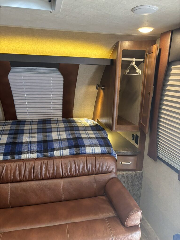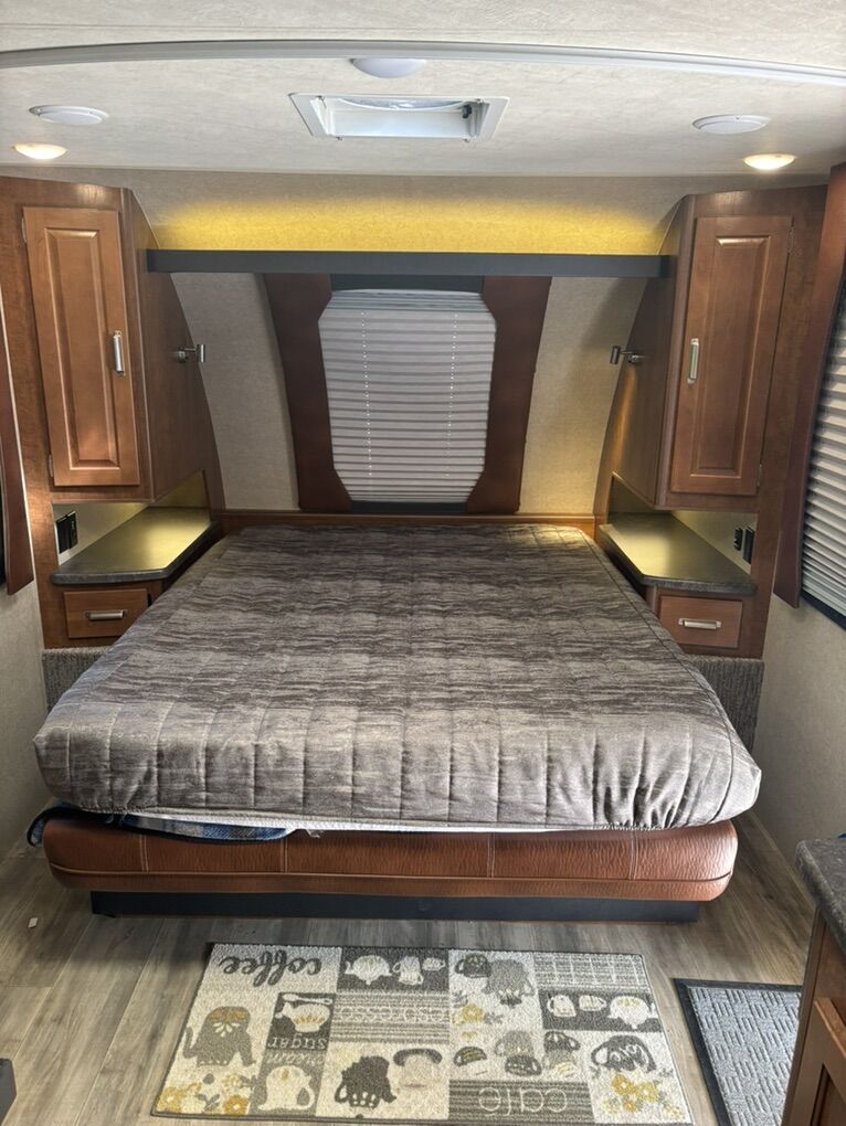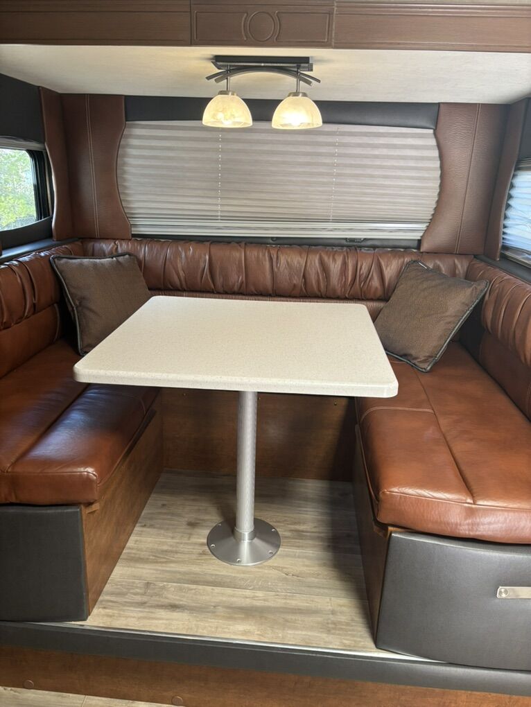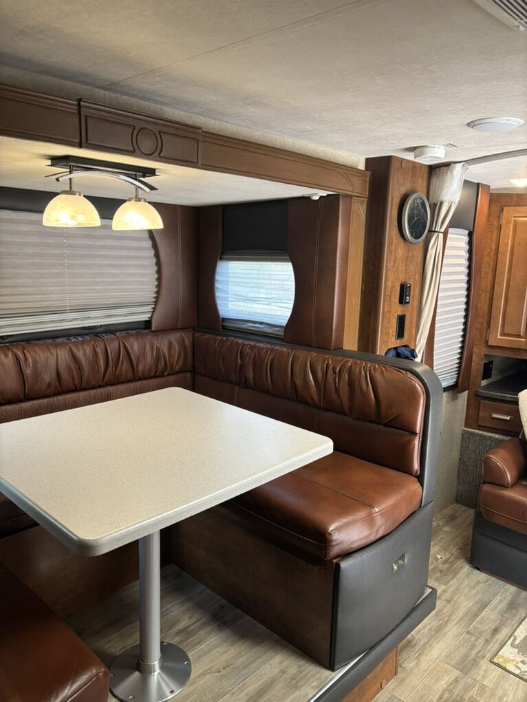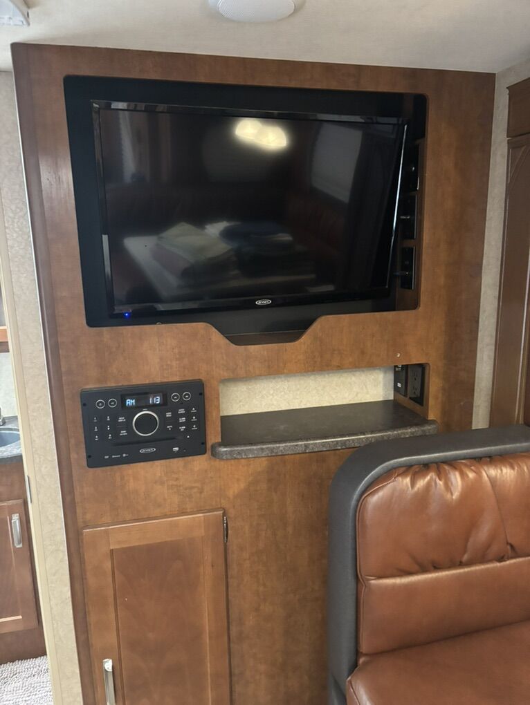 Interior Roadster (faux leather) Convertible Sofa/Upgraded Memory Foam Queen Bed. Day/Night Shades Bedroom & Dinette 3 Burner High Output Range with Oven Microwave Oven TV LED 32 Inch 12 Volt Fantastic Roof Vent Auto Fan Spare Tire A/C Colman 13.5 w/Wall Control Electric Stabilizer Jacks Electric Smart Tongue Jack Lift Kit (2-5/8”) Solar Panel 160W Awning 16’ Power w/LED Lighting Ladder Pull Out Storage Drawer w/Table Keyless Entry w/Key Fob All Weather Package & Tri Five PropaneTank Price includes Round Bar stabilizer & equalizer hitch WITH hitch handling tool, specialized hitch lock, wheel covers & storage boxes. Paid $45,000 new, 1 owner is in excellent condition. lots of extras ready for camping.