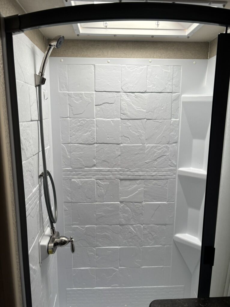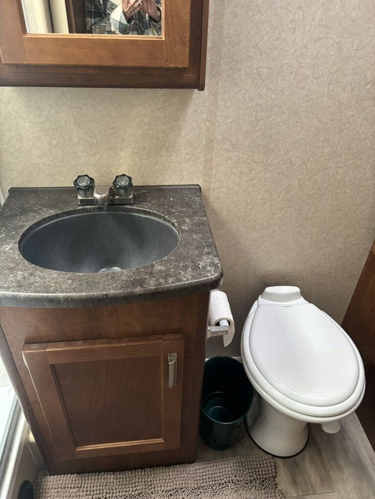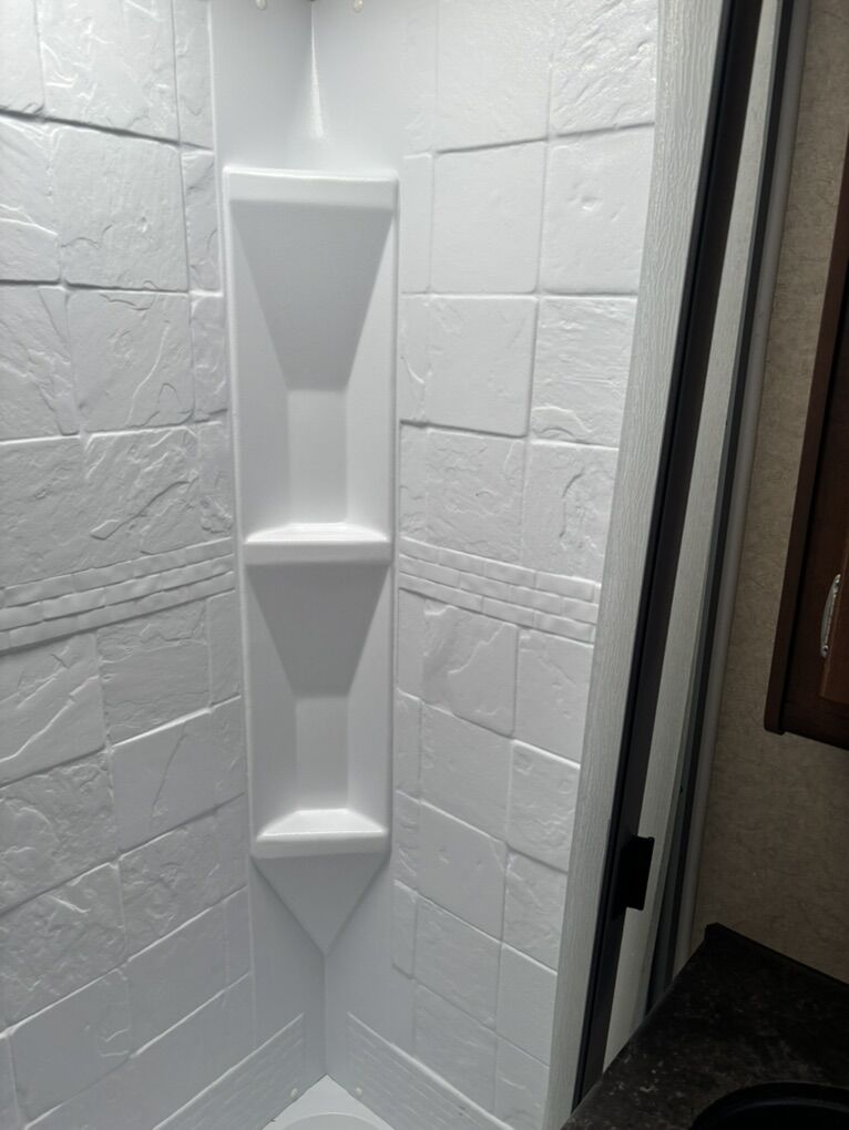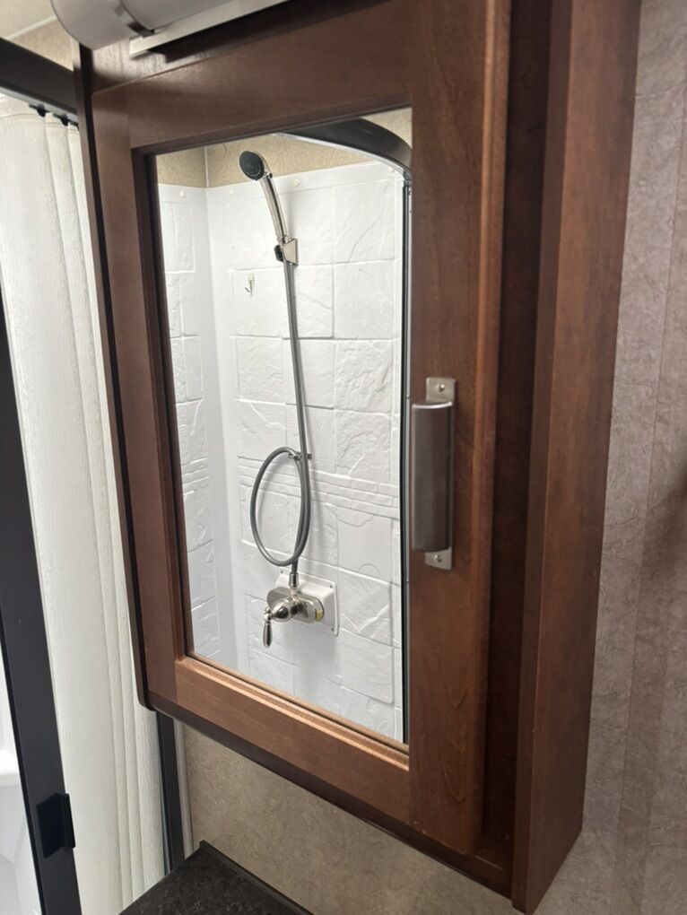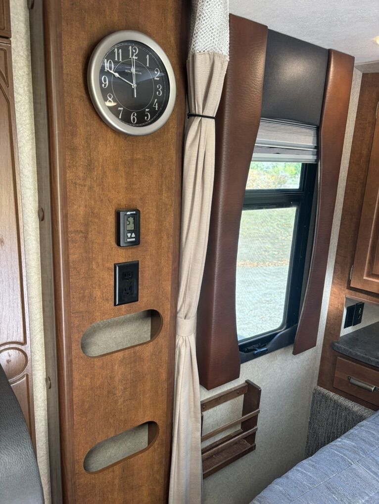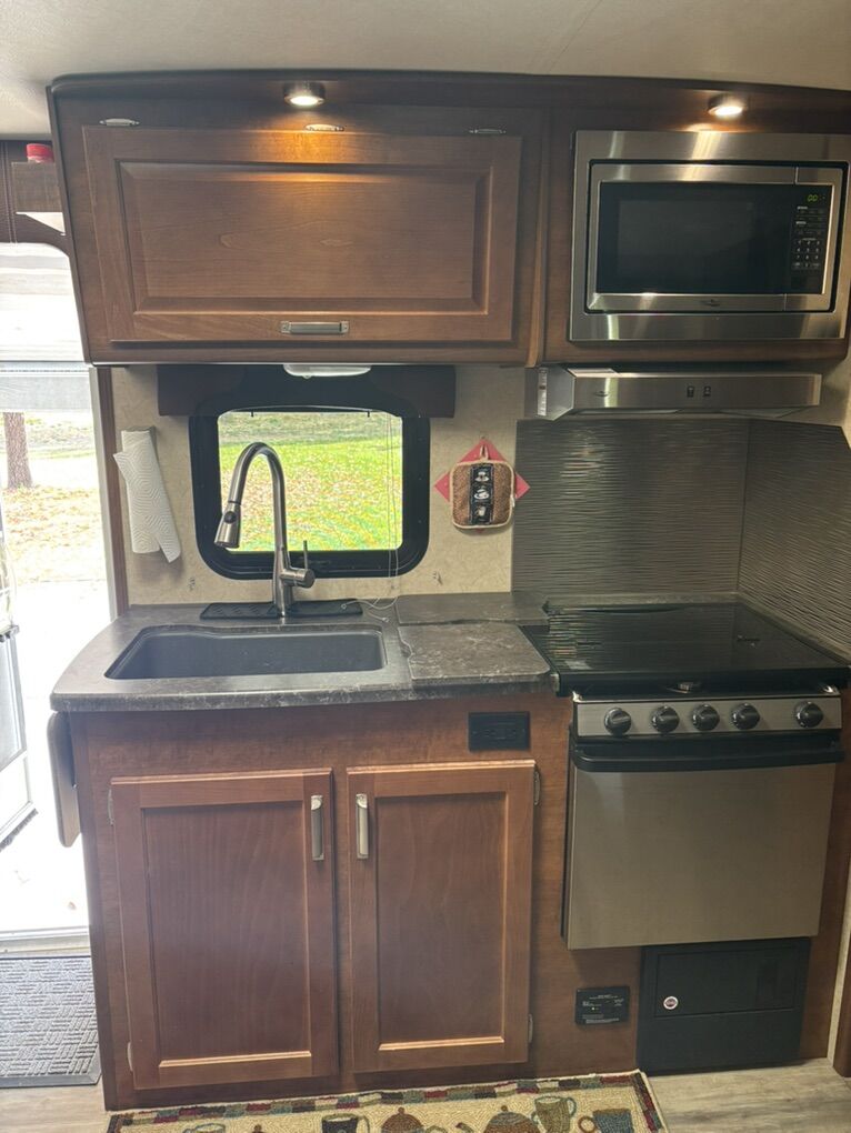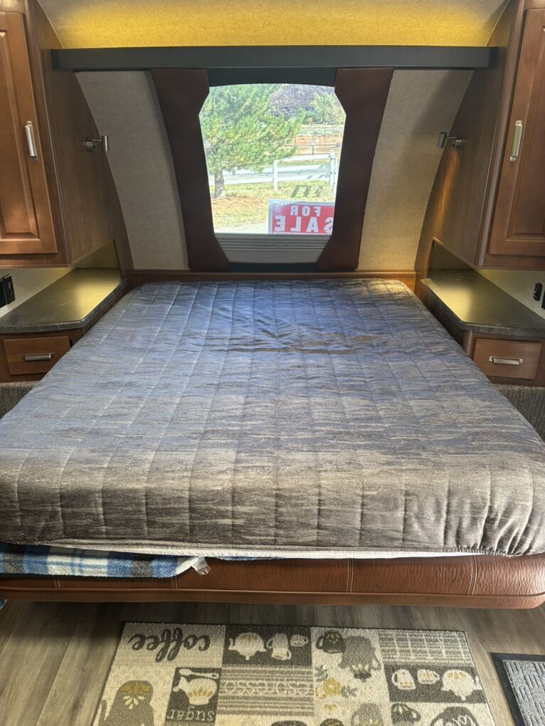 Interior Roadster (faux leather) Convertible Sofa/Upgraded Memory Foam Queen Bed. Day/Night Shades Bedroom & Dinette 3 Burner High Output Range with Oven Microwave Oven TV LED 32 Inch 12 Volt Fantastic Roof Vent Auto Fan Spare Tire A/C Colman 13.5 w/Wall Control Electric Stabilizer Jacks Electric Smart Tongue Jack Lift Kit (2-5/8”) Solar Panel 160W Awning 16’ Power w/LED Lighting Ladder Pull Out Storage Drawer w/Table Keyless Entry w/Key Fob All Weather Package & Tri Five PropaneTank Price includes Round Bar stabilizer & equalizer hitch WITH hitch handling tool, specialized hitch lock, wheel covers & storage boxes. Paid $45,000 new, 1 owner is in excellent condition. lots of extras ready for camping.