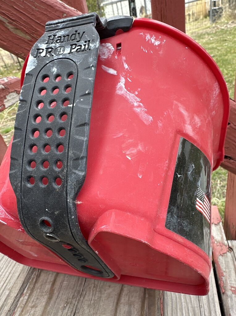 Used once. Paint on bucket can easily be peeled off. Adjustable strap
