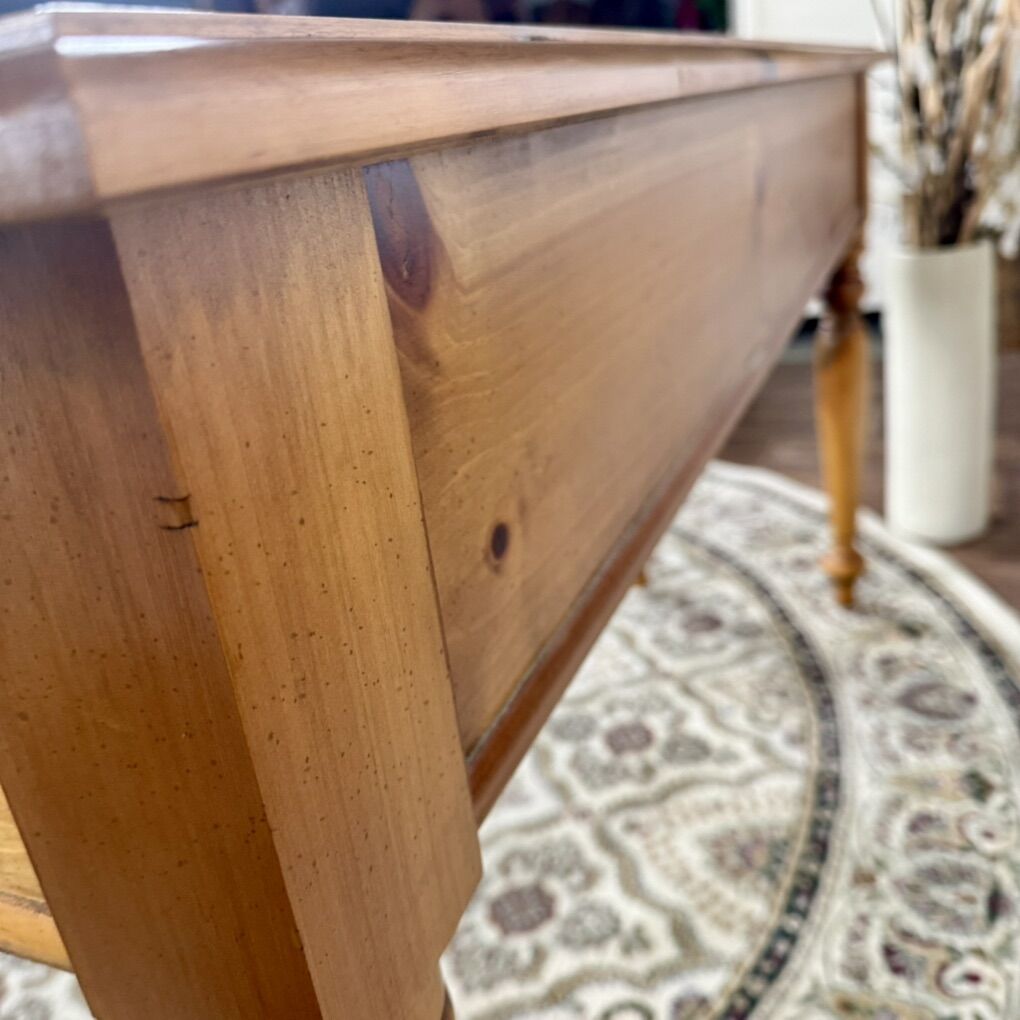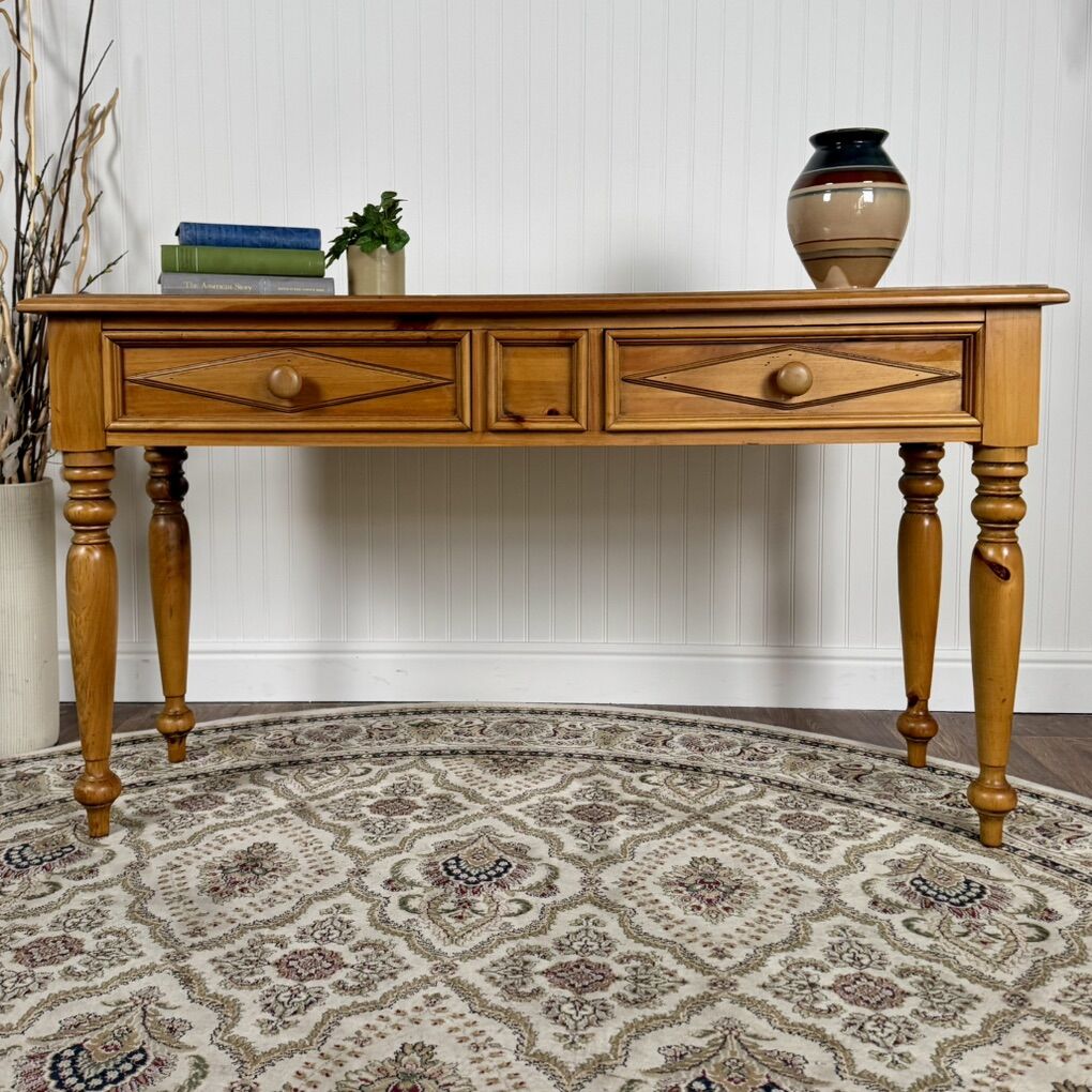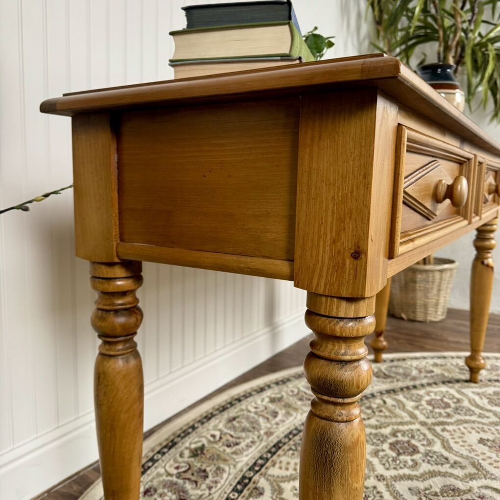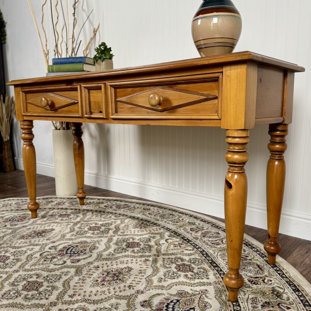 ApplePayWarm honey pine console table with turned legs, raised diamond-panel drawers, and dovetail joinery. Sturdy, clean, and all original. Perfect for an entryway, sofa table, or laptop desk. Would work well in rustic, farmhouse, or traditional interiors.