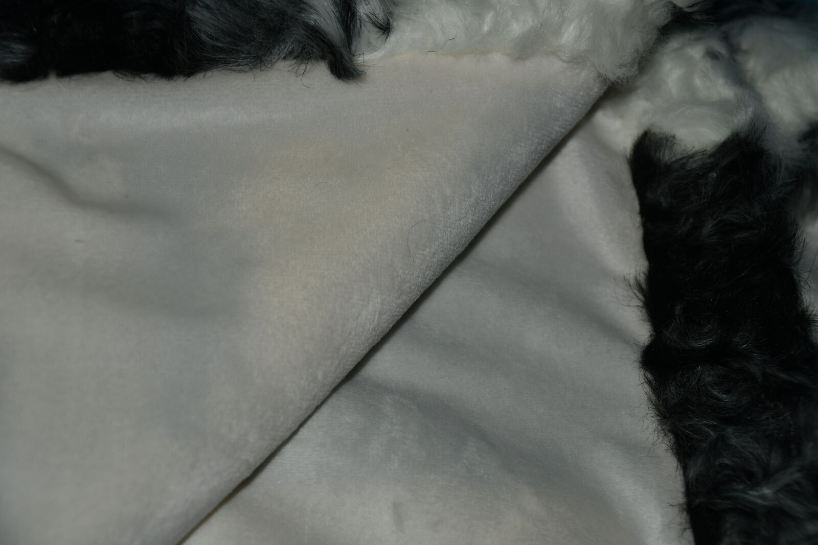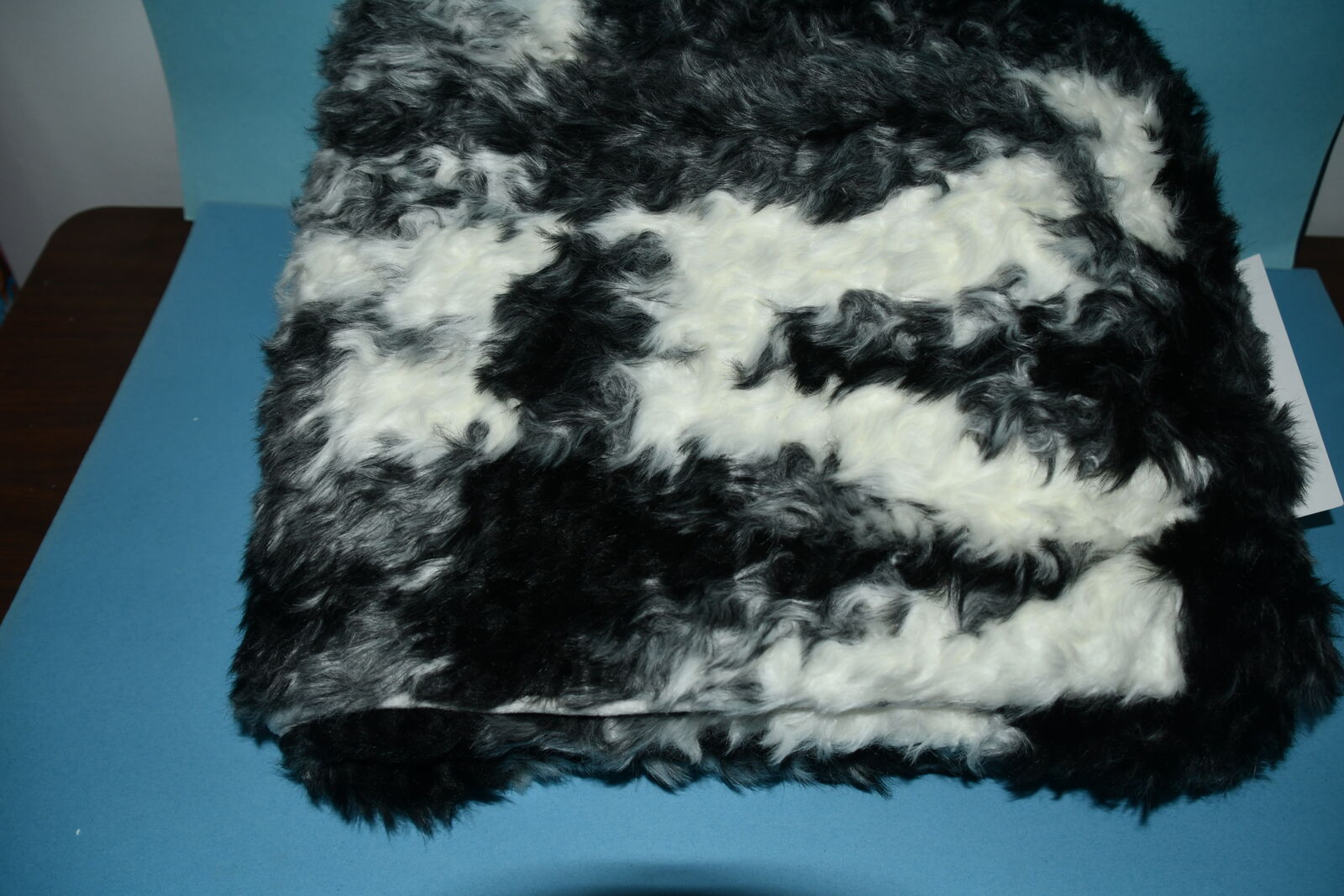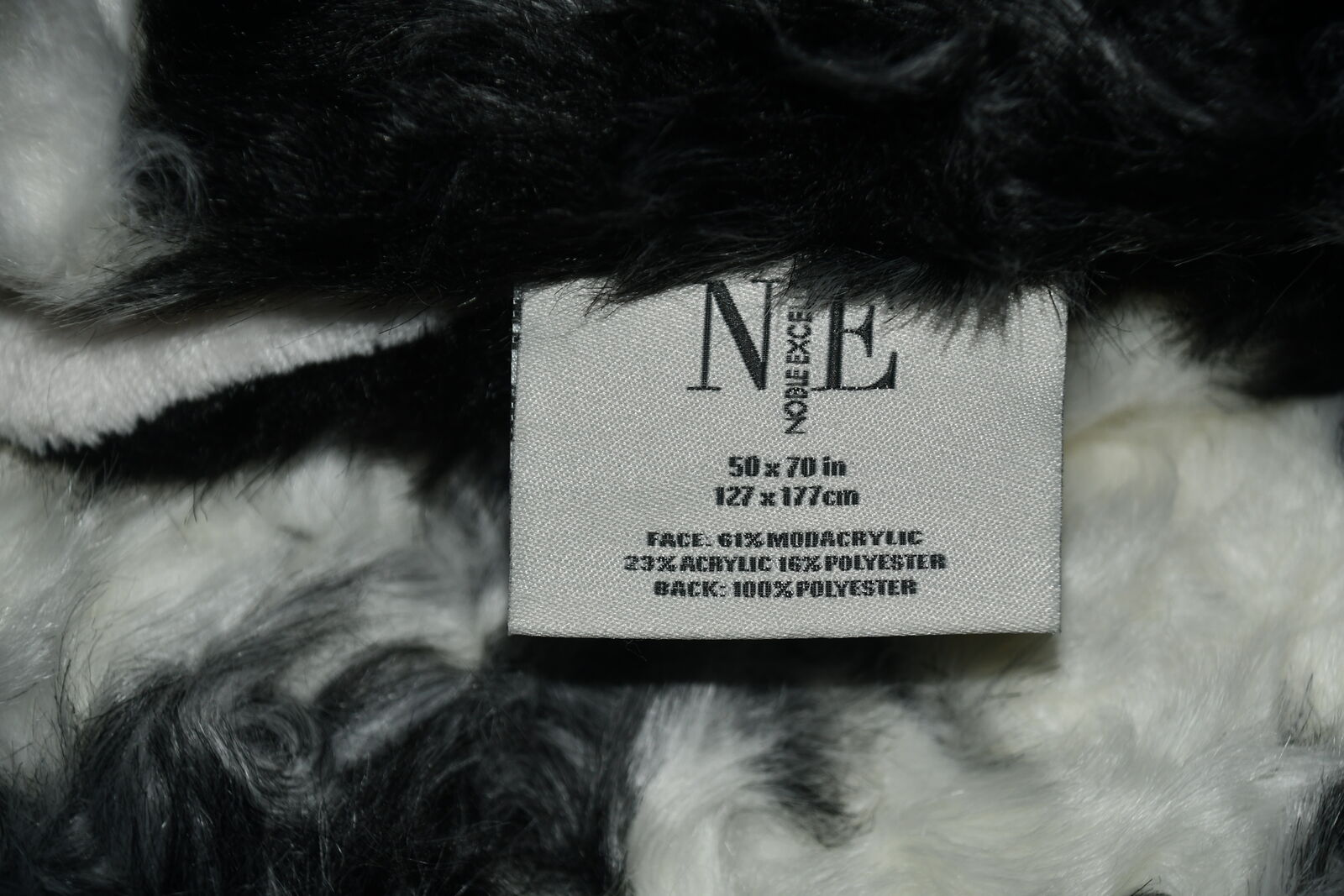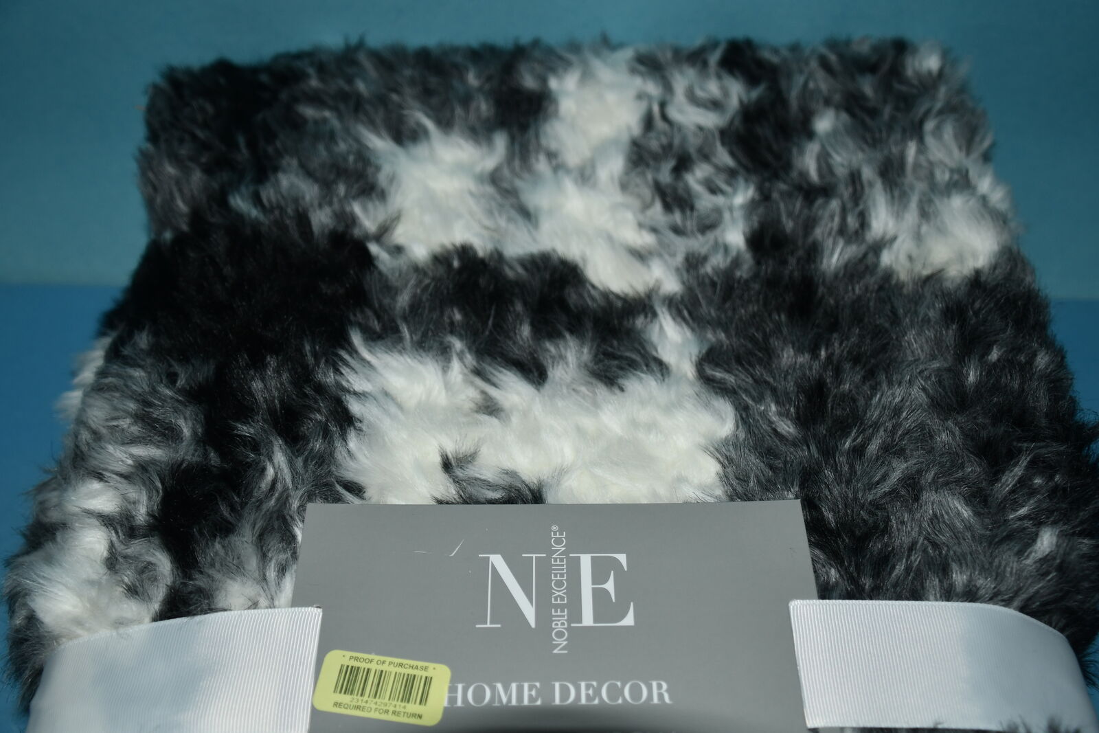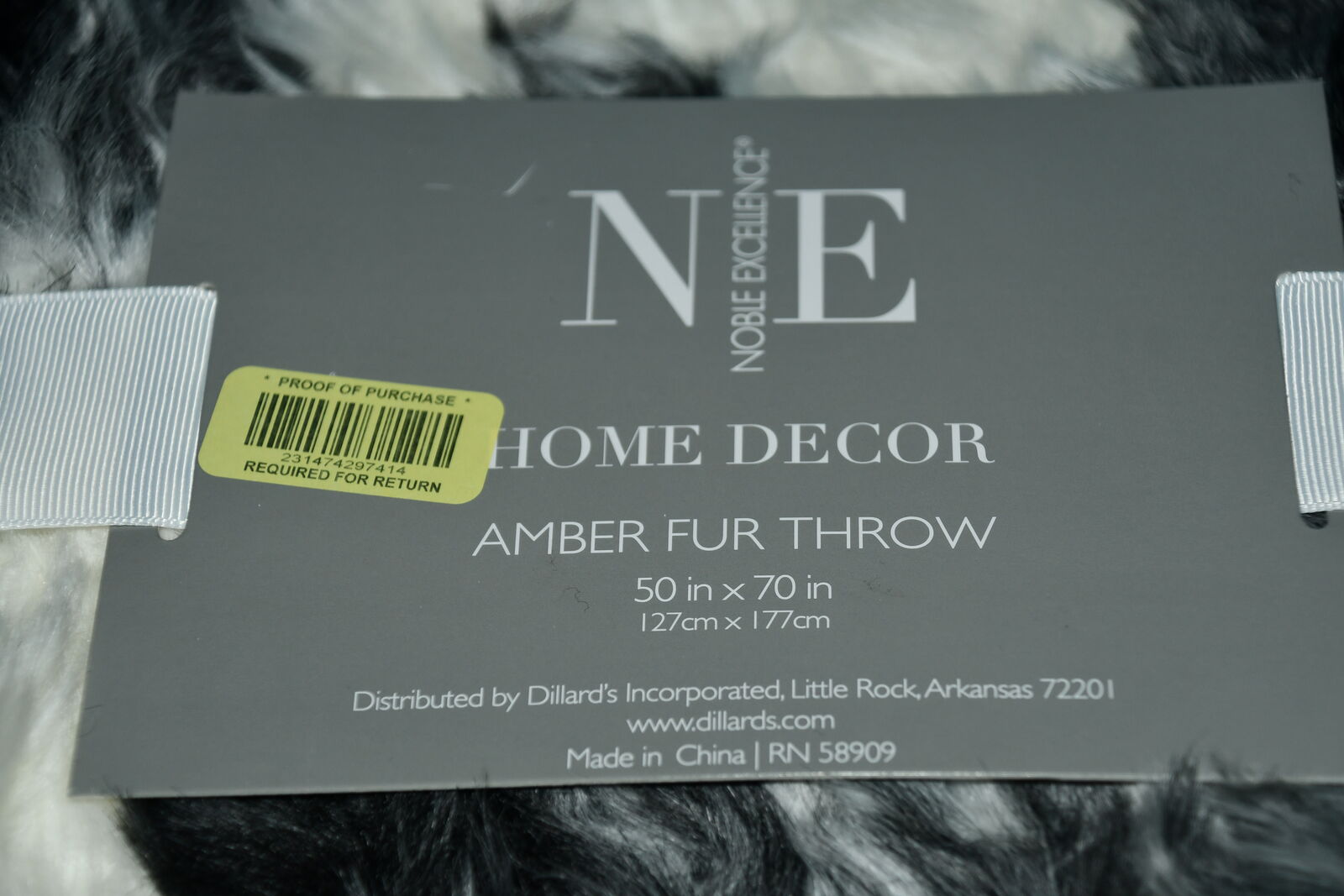 This NEW DILLARDS "AMBER FUR" BLANKET /THROW is 50" x 70". It is BLACK & WHITE. Our home is smoke free. Questions??? Please ask. We are located in Plain City. Cash only please.