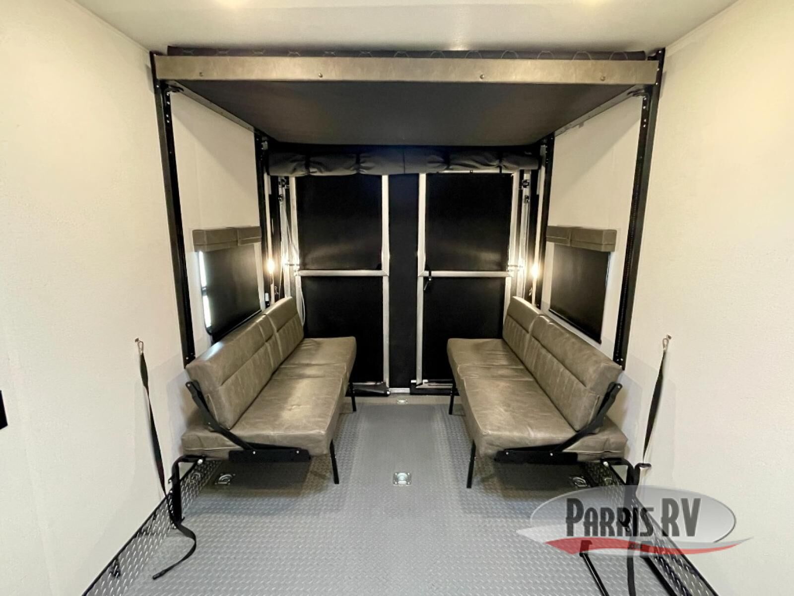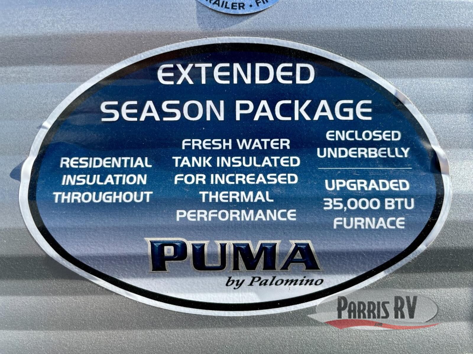 The most spacious toy hauler travel trailer in the Puma Unleased lineup, this unit is ready for adventure when you are! There are dual entry doors, one of which leads to the 13' separate garage. Here, you'll find 62" rollover sofas, an optional queen bed electric lift, plus a 7' 3" ramp door with spring assist for easy unloading. The walk-through bath will be easily accessible for everyone to use, and the main living room is shared with the kitchen so everyone can gather together when dinner is being made. A 21" stainless steel oven comes standard in the kitchen, along with a stainless steel microwave and an 11 cu. ft. 12V stainless steel residential refrigerator. When you're ready for bed, the front private bedroom with an RV queen bed will provide a great night's rest, and there are dual shirt closets to keep your clothes wrinkle-free.
