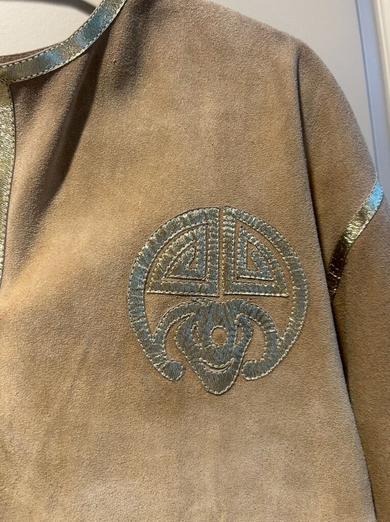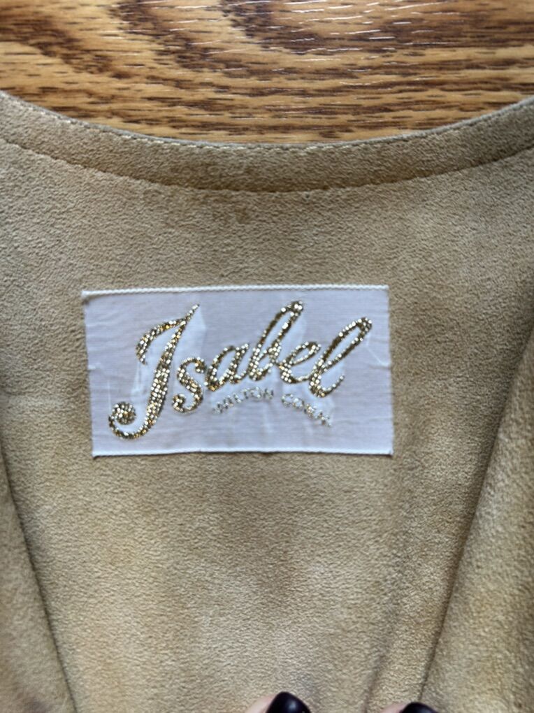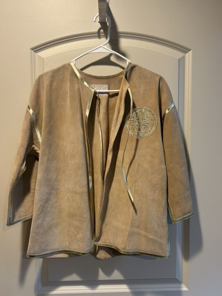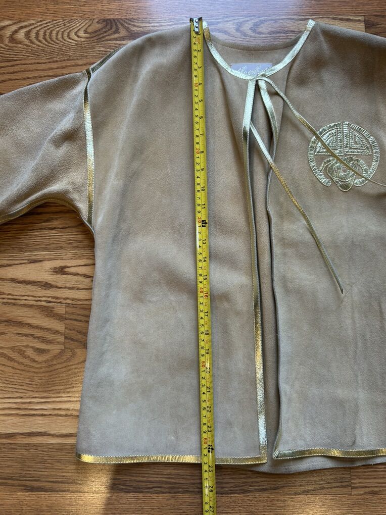 VenmoVintage suede leather jacket by Isabel with gold trim and Chinese symbol on chest. Tie closures. Clean smoke free. One size fills most. Measurements in pictures.