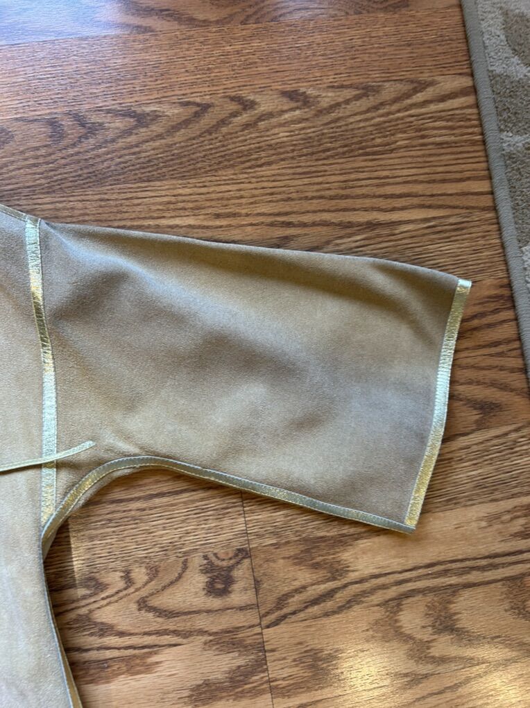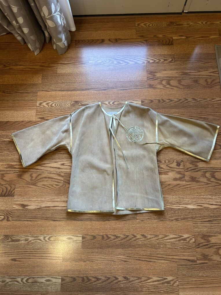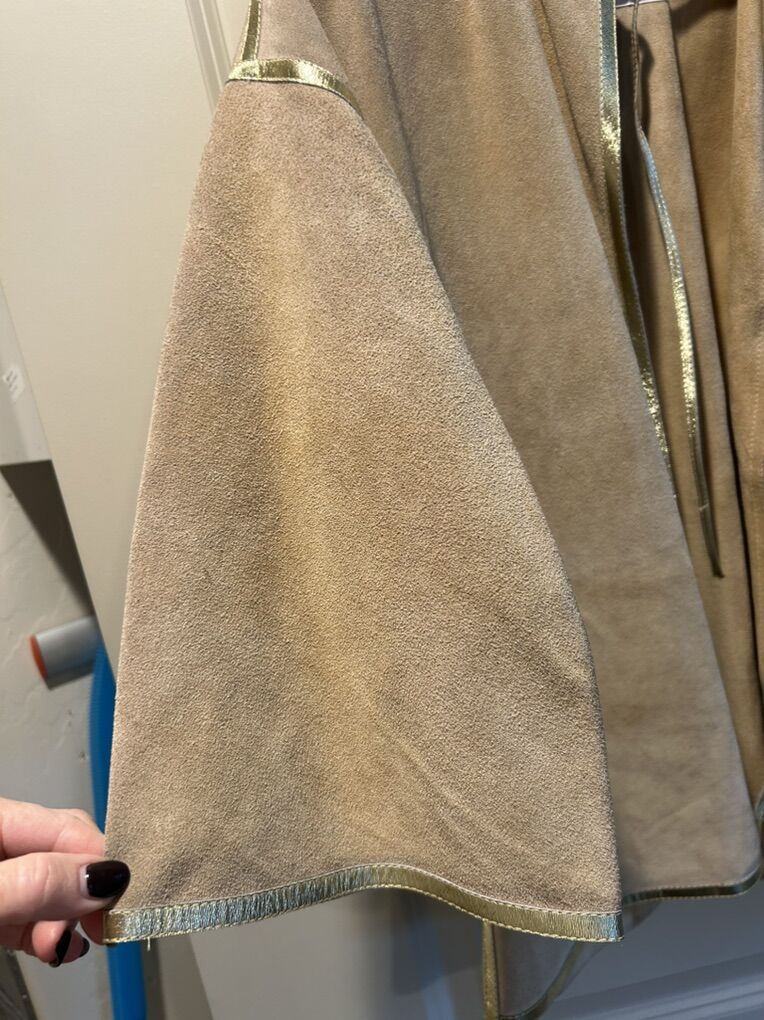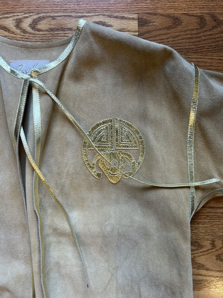 VenmoVintage suede leather jacket by Isabel with gold trim and Chinese symbol on chest. Tie closures. Clean smoke free. One size fills most. Measurements in pictures.