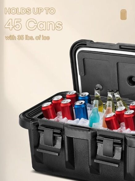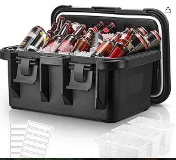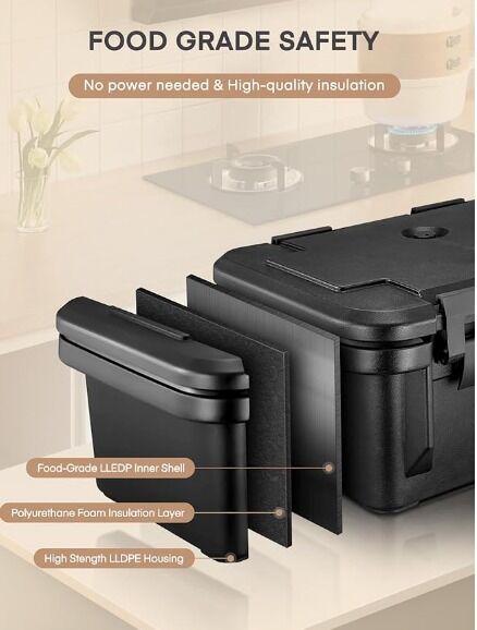 About this item 6 π―πππ πΆπππππππ πππ π°πππππππππOur insulated portable cooler is the ideal choice for keeping your food fresh. It features LLDPE shell, PU foam insulation layer, and food-grade LLEDP inner shell. The embedded seal enhances thermal performance, allowing you to keep food warm for 4-6 hours and chilled for 3-4 hours, all without the need for electricity or energy. Enjoy fresh-tasting food anytime and anywhere 36 πΈπ» π¬ππππ π³ππππ πͺπππππππThis insulation food pan carrier boasts an extra-large capacity of 36 QT, with internal dimensions of 21" x 13" x 8". It comes equipped with three 3/1 pans, each marked with the NSF logo, measuring 12.5" x 8" x 7". Whether for hot dishes or cold drinks, it can easily accommodate a variety of foods, making it perfect for cafeterias, restaurants, hotels, and family gatherings πͺπππππ πΊπππππππ π«πππππThe unique stacking design allows you to safely stack multiple catering cooler, with a recessed top cover that effectively utilizes space, making it convenient for transport and storage π»πππππππππ π«πππππThe insulated food warmer features a top-loading design for easy food access. The menu slot on the top allows you to label food using the included stickers, reducing the need to frequently open and close the lid. Four nylon clips secure the door tightly, locking in the temperature, while the ventilation cover helps balance air pressure and control humidity, ensuring safe and stable food storage πΊπππππππ πππ π½ππππππ πΊππππππππOur food warmer box features a durable design that withstands transportation and high temperatures. It is ideal for a range of situations, including catering, takeout, outdoor events, and business gatherings. Examples include restaurants, hotels, parties, banquets, camping, cafeterias, and more.