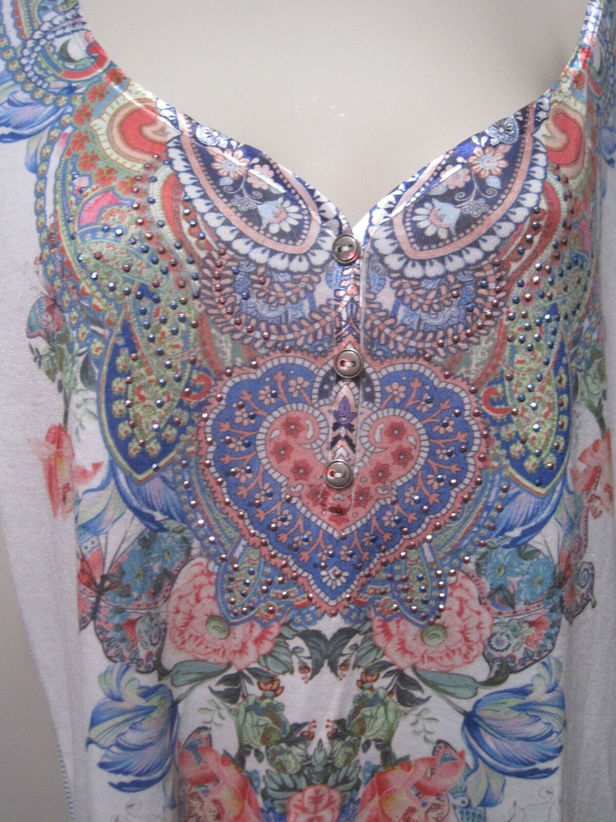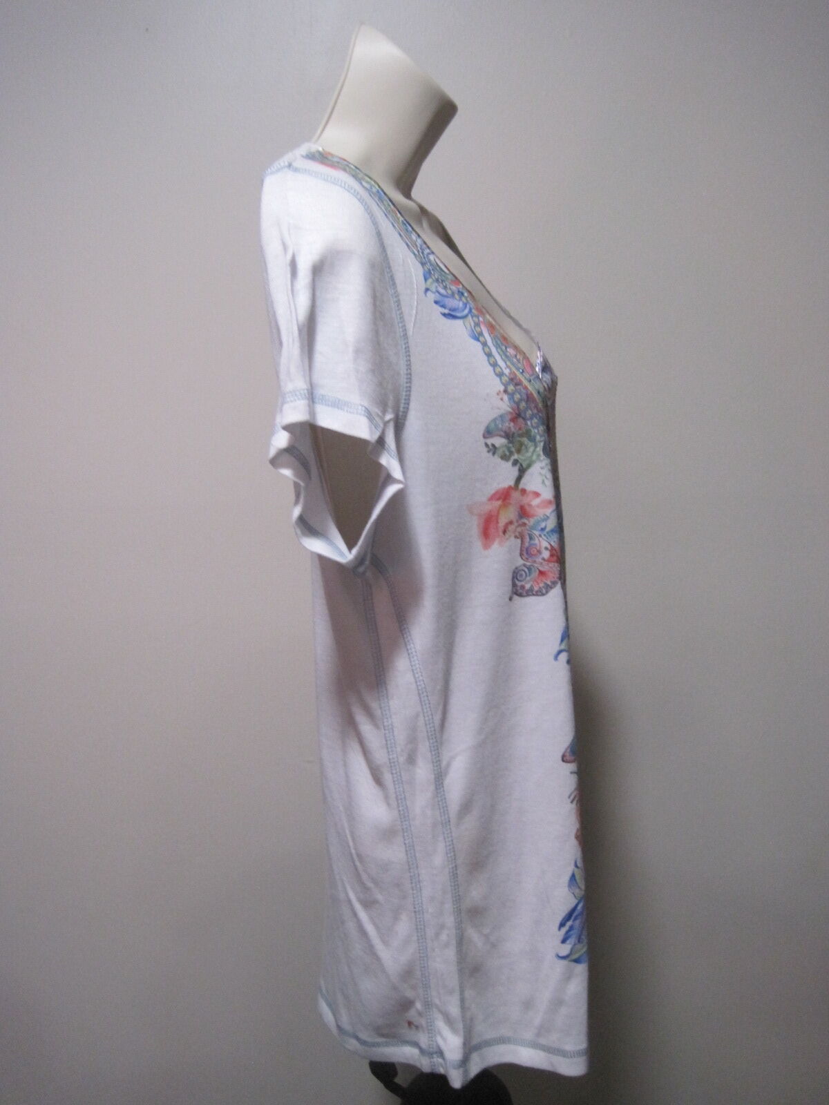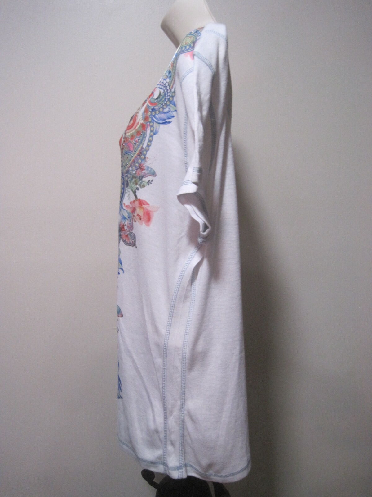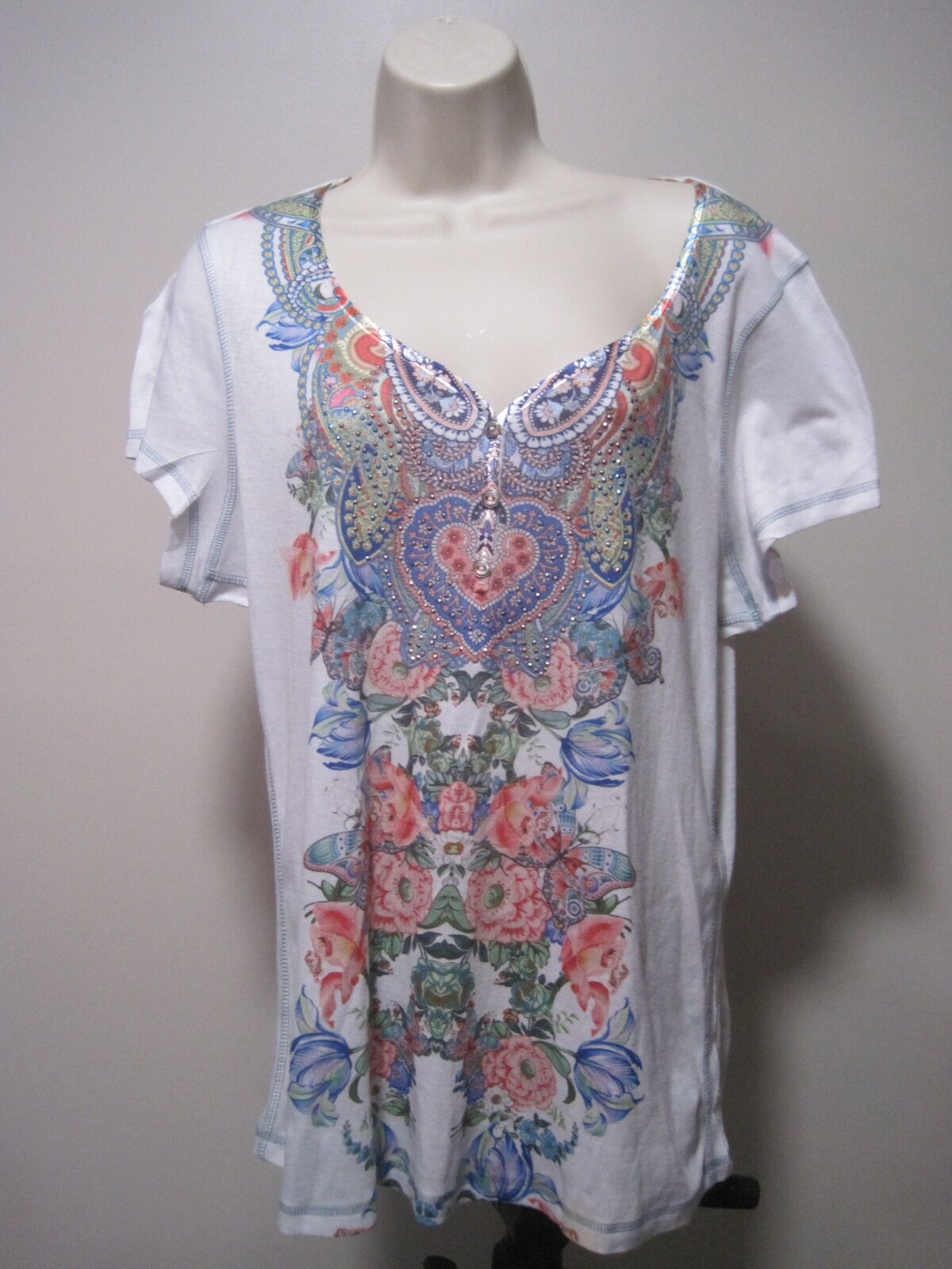 This One World Live and Let Live Shirt is a stylish boho floral top perfect for women in size XL. The white shirt features a sweetheart neckline, short sleeves, and a pullover closure. It is ideal for travel, parties, or casual wear during the summer, fall, or spring seasons. Made of lightweight and stretchy polyester material, this shirt also adds a touch of whimsy with colorful floral accents and beaded details. The regular fit and cap sleeves make it a comfortable and versatile addition to any wardrobe.