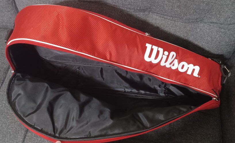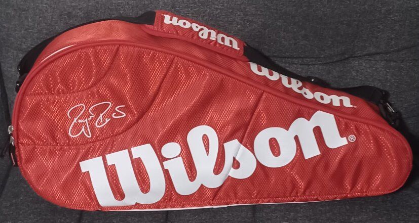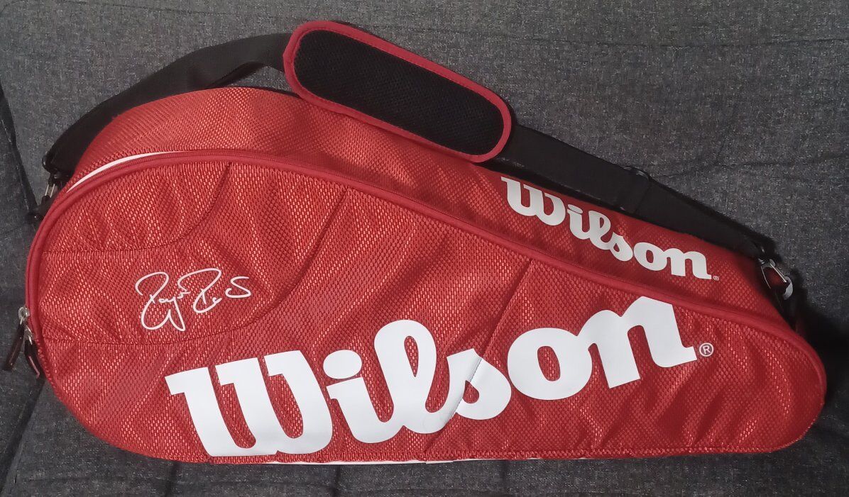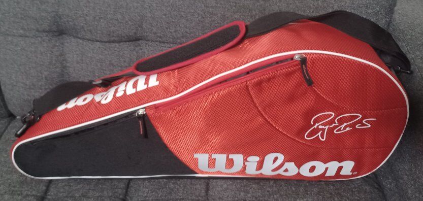 VenmoRoger Federer Wilson tennis racket/racquet bag. Holds about three tennis rackets. It has 2 side pockets to store personal belongings/gear. Very lightly-used condition.