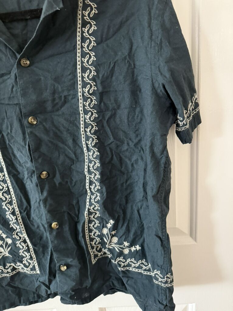 Men’s embroidered old navy shirt linen blend M blue cream stitching