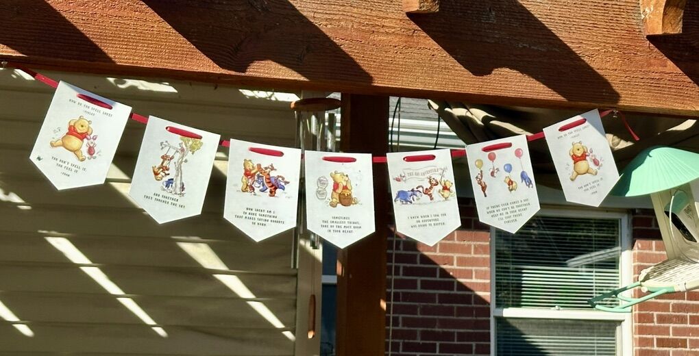 ZelleWinnie the Pooh Party Decor all used but in good condition and ready to share with another Pooh lover. Two plastic rectangle table cloths, two banners with quotes from the books (one with red ribbon and one with yellow), one “Sweet as can be” banner, about 20 party favor sacks, a cake topper cutout, and a pin the tail on Eyeore game with 15 unused sticky tails and blindfold.