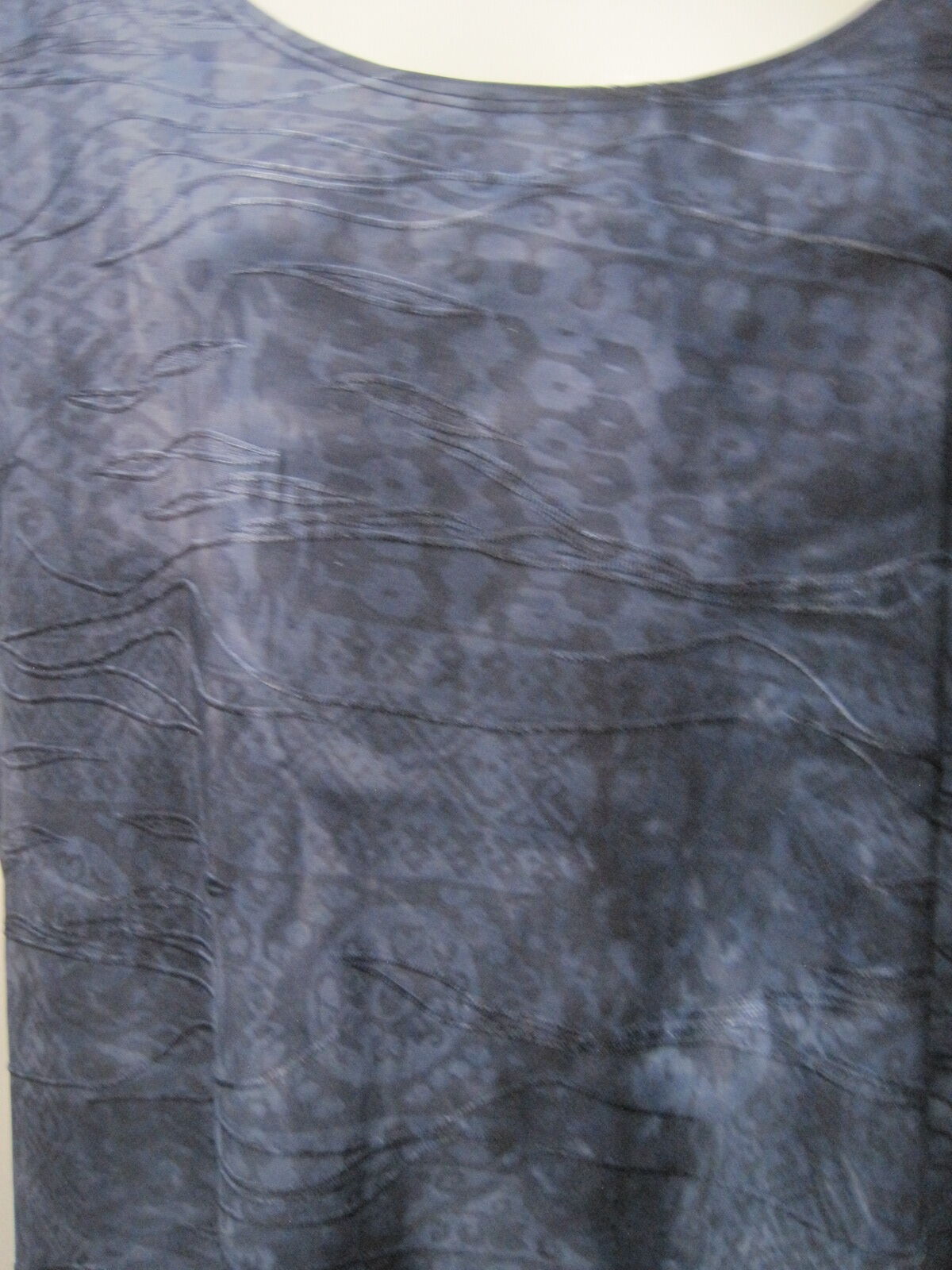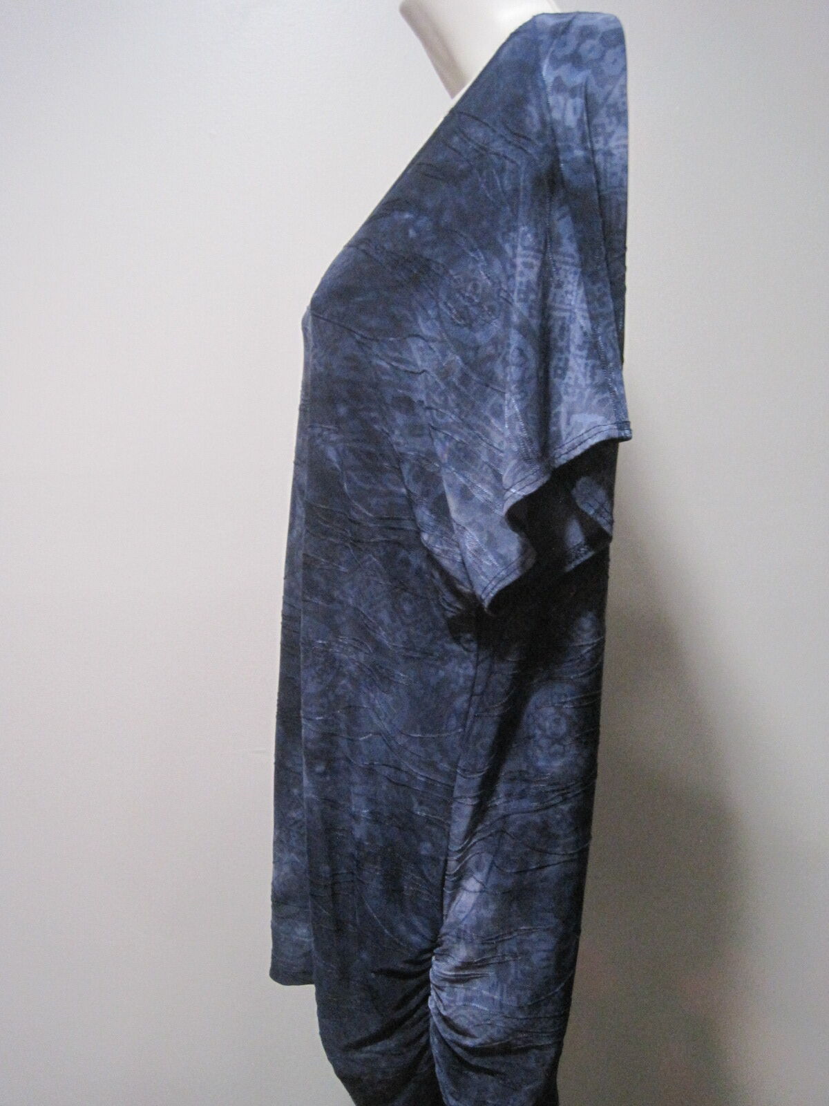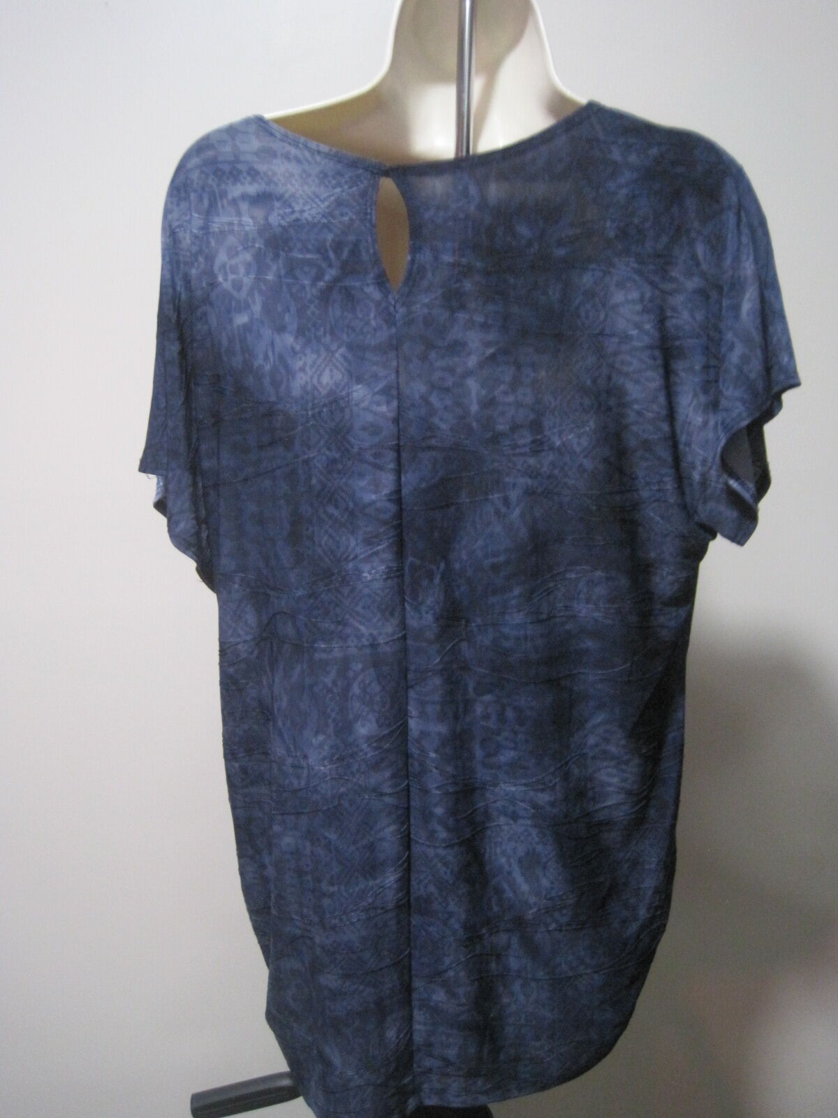 The Agenda Top Women's Large Short Sleeve Wavy Dark Blue Geometric Casual Tee Shirt is a stylish and comfortable top perfect for casual occasions. Made of lightweight polyester fabric, this shirt features a round neck, pullover closure, and dolman sleeves for a relaxed fit. The blue geometric pattern adds a trendy touch, while the soft fabric and regular fit make it suitable for summer, fall, and spring wear. The shirt is machine washable, making it easy to care for and versatile for travel or everyday wear.