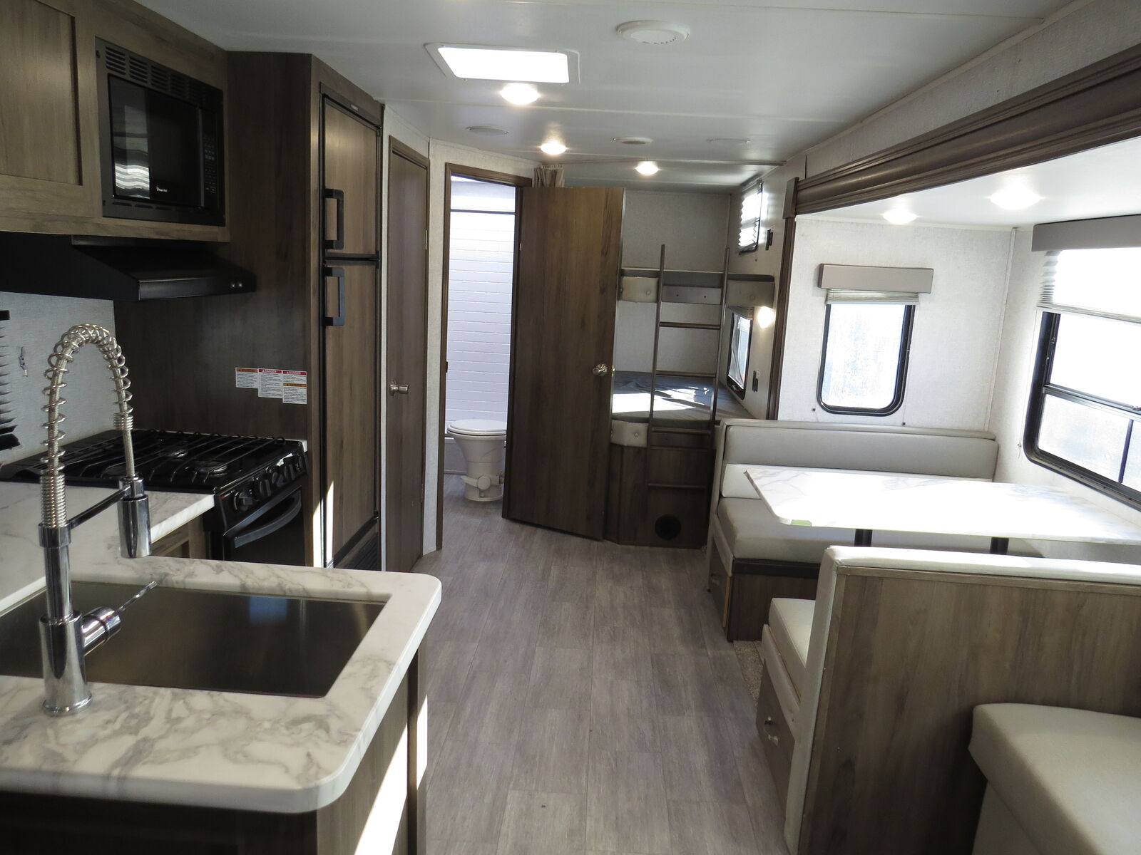 2 Big Rear Bunks, Booth Dinette & Couch Slide, Front Queen bed!, Lots of storage! Side Kitchen, Corner Bathroom with double Entry, Couch & Booth Dinette Makes down to bed, A/C unit and Heat.