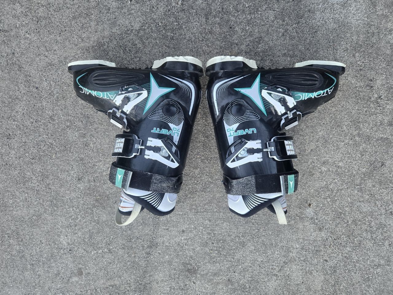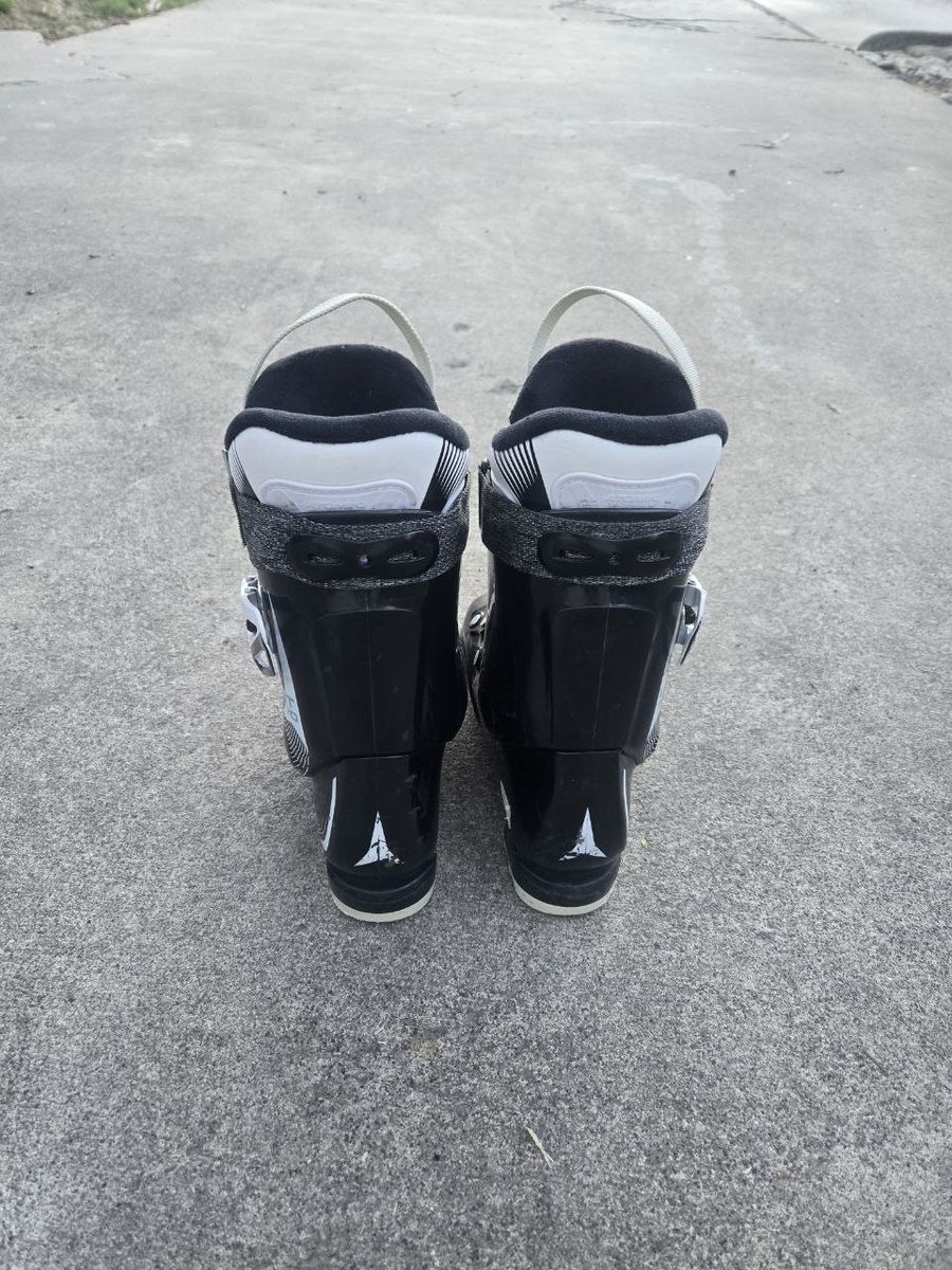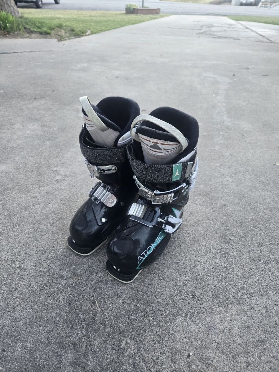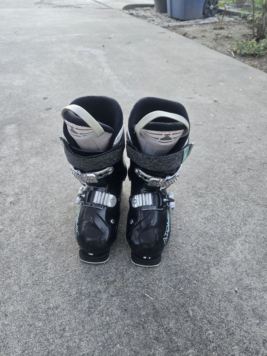 VenmoGirls Atomic Livefit 70 downhill ski boots. Sole length is 279mm. Mondo Point 23-23.5 which is a women's/girls 5-5.5 shoe size. Flex: 70. Elasticized power strap for maintaining constant cuff/shin contact. 2 adjustable buckles to get a secure and comfortable fit. Great ski boots to use this ski season. Text please.