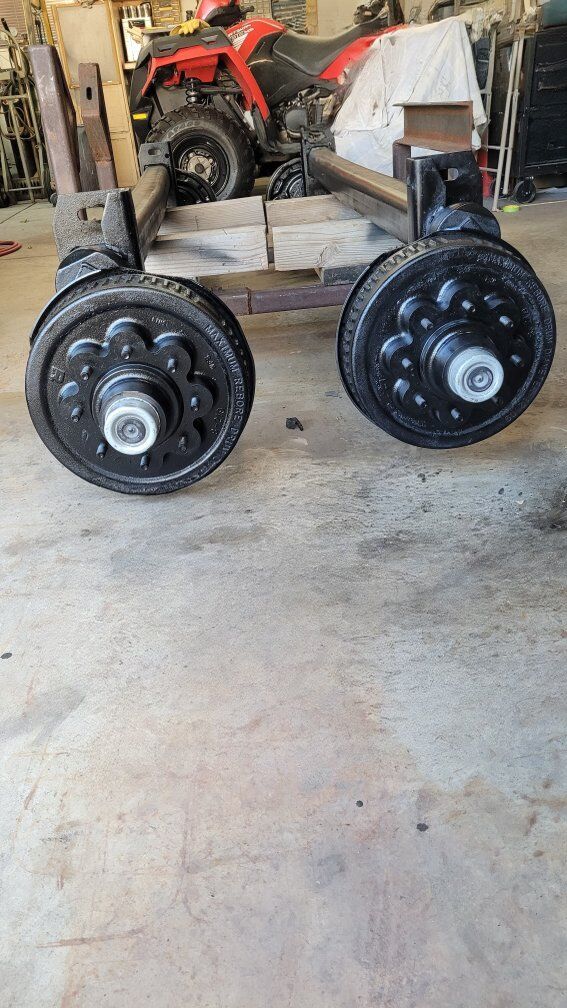 2 each used Dexter Torflex Number 12, 7000lb trailer axles. 8 lug with electric brakes. Hub face 94 inch, outside bracket 80 inch. sold as a pair, $1400. 801-510-2589.