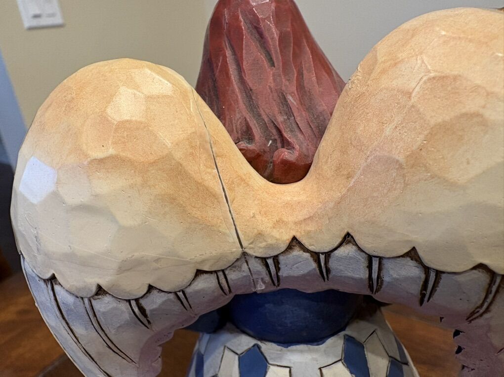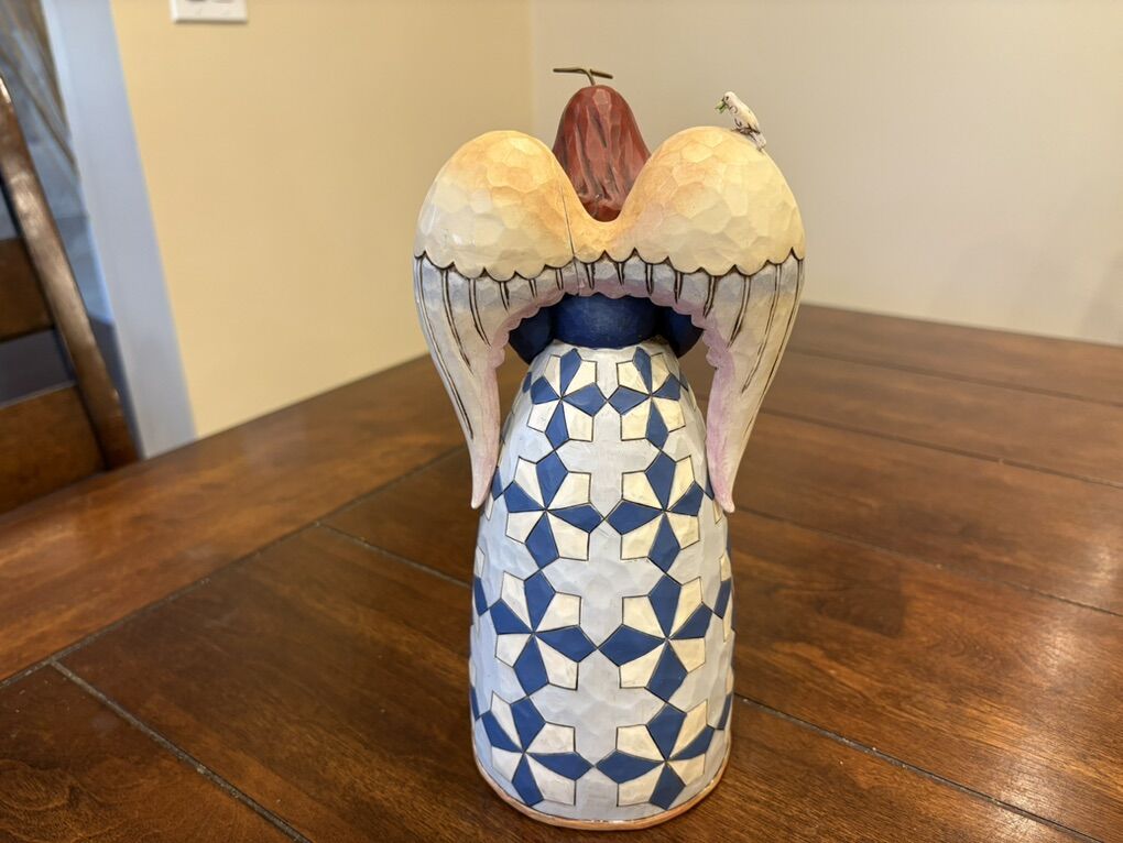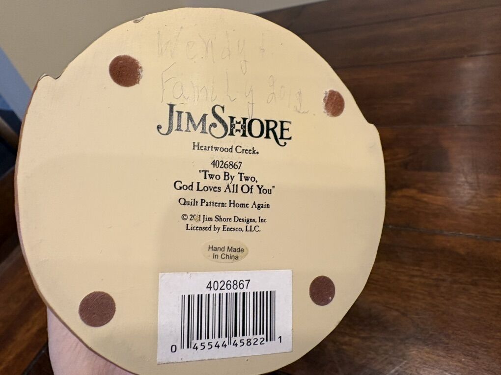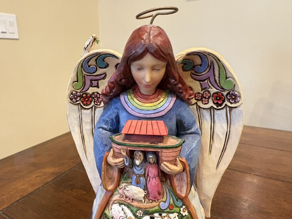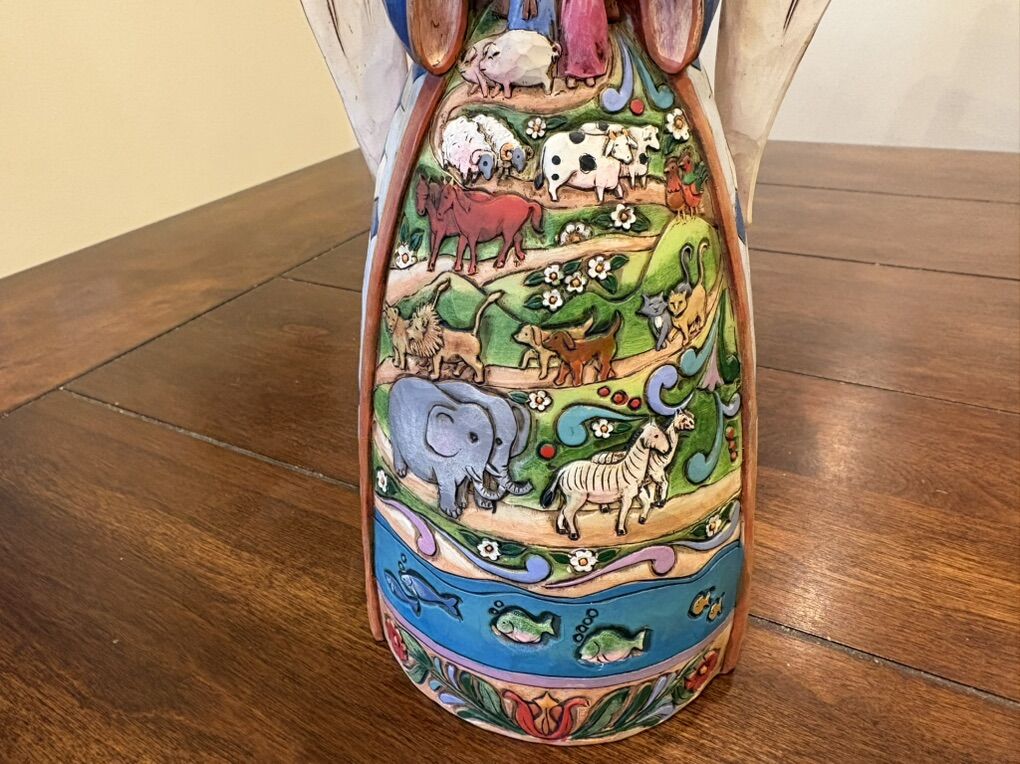 I have a Jim Shore Heartwood Creek Noah’s Ark angel. It’s called “Two By Two, God Loves All of You”. She is 9 3/4 inches tall. She has a dove on her shoulder, is holding Noah’s Ark and has animals on the front of her skirt. She has a small split on the back of her wings and has a light pen name and date written on the bottom (see the last 2 pictures). See my other ads for jewelry, artwork, home decor and more.